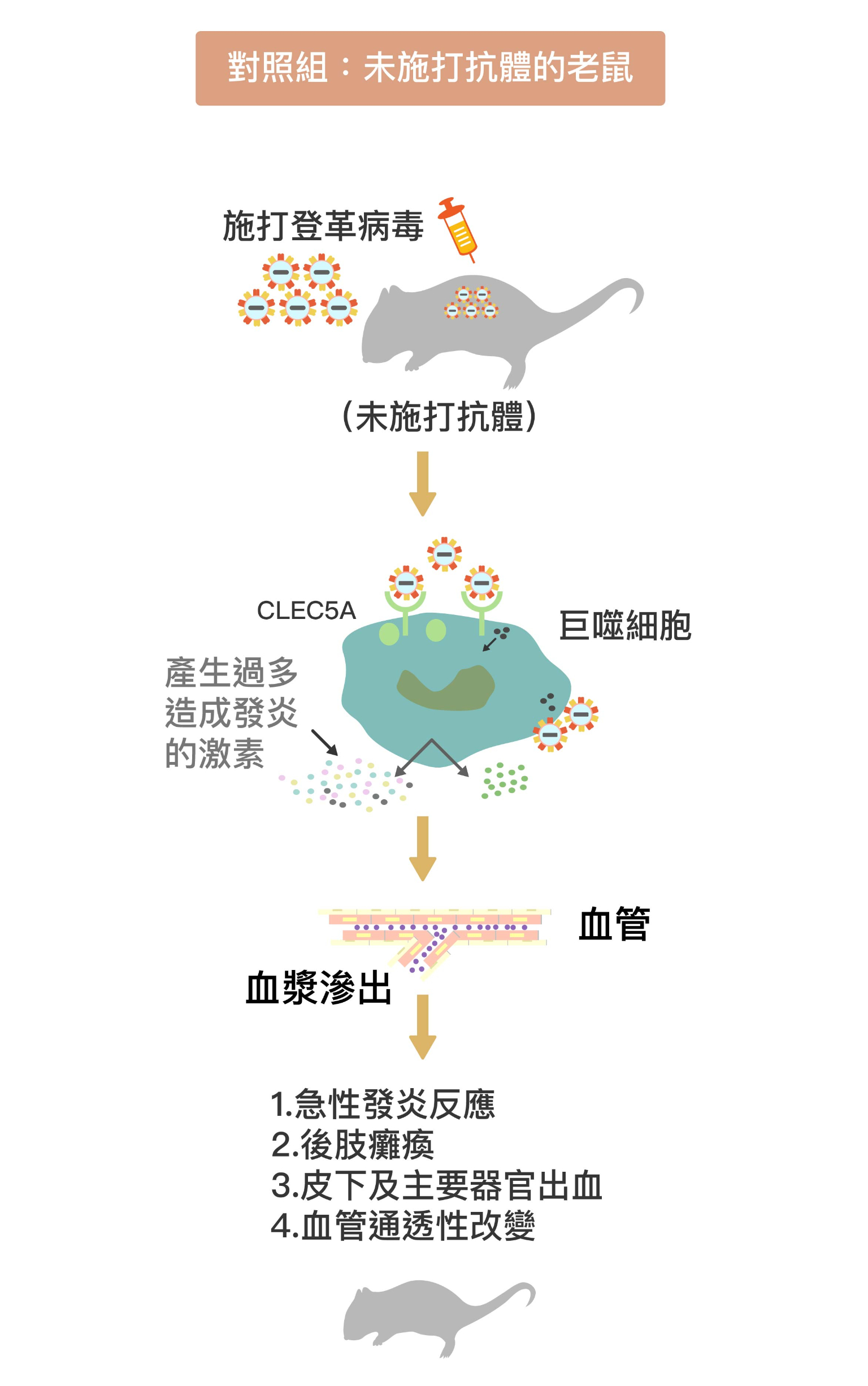 第二步,備製 CLEC5A 的拮抗性單株抗體(antagonistic anti-CLEC5A monoclonal antibody),打在小鼠身上,讓這些抗體搶先佔據巨噬細胞的 CLEC5 受體位置,阻斷登革病毒感染細胞的路徑。