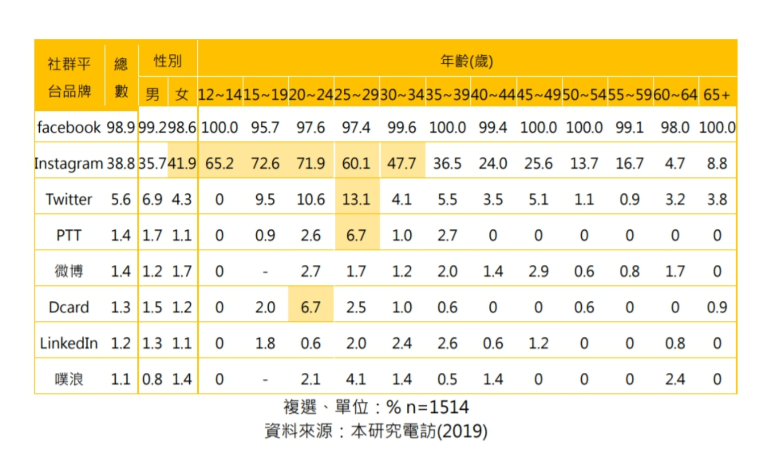 有趣的是,98.8%的受訪者有使用Facebook,其次為Instagram使用率有38.8%,又以12-34歲的使用率較高,也是少數女性多於男性的社群,Twitter則只有4.3%,更令任意想不到是,擁有廣大鄉民的PTT在這份調查中使用率僅1.4%。