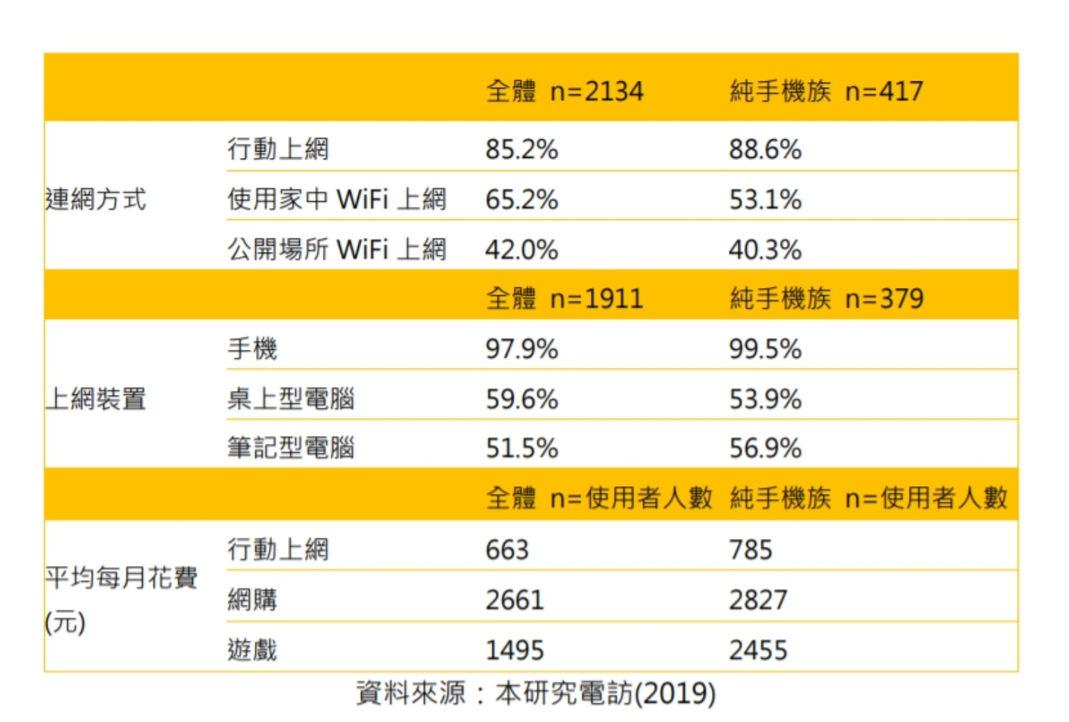 台灣網路資訊中心日前公布2019台灣網路報告,並首次加入手機調查。從中可以發現純手機族的使用行為與全體略有不同,純手機族在使用不論是公共區域還是家中wifi的使用率都略低全體,推測與此族群對手機依賴度更高有關。