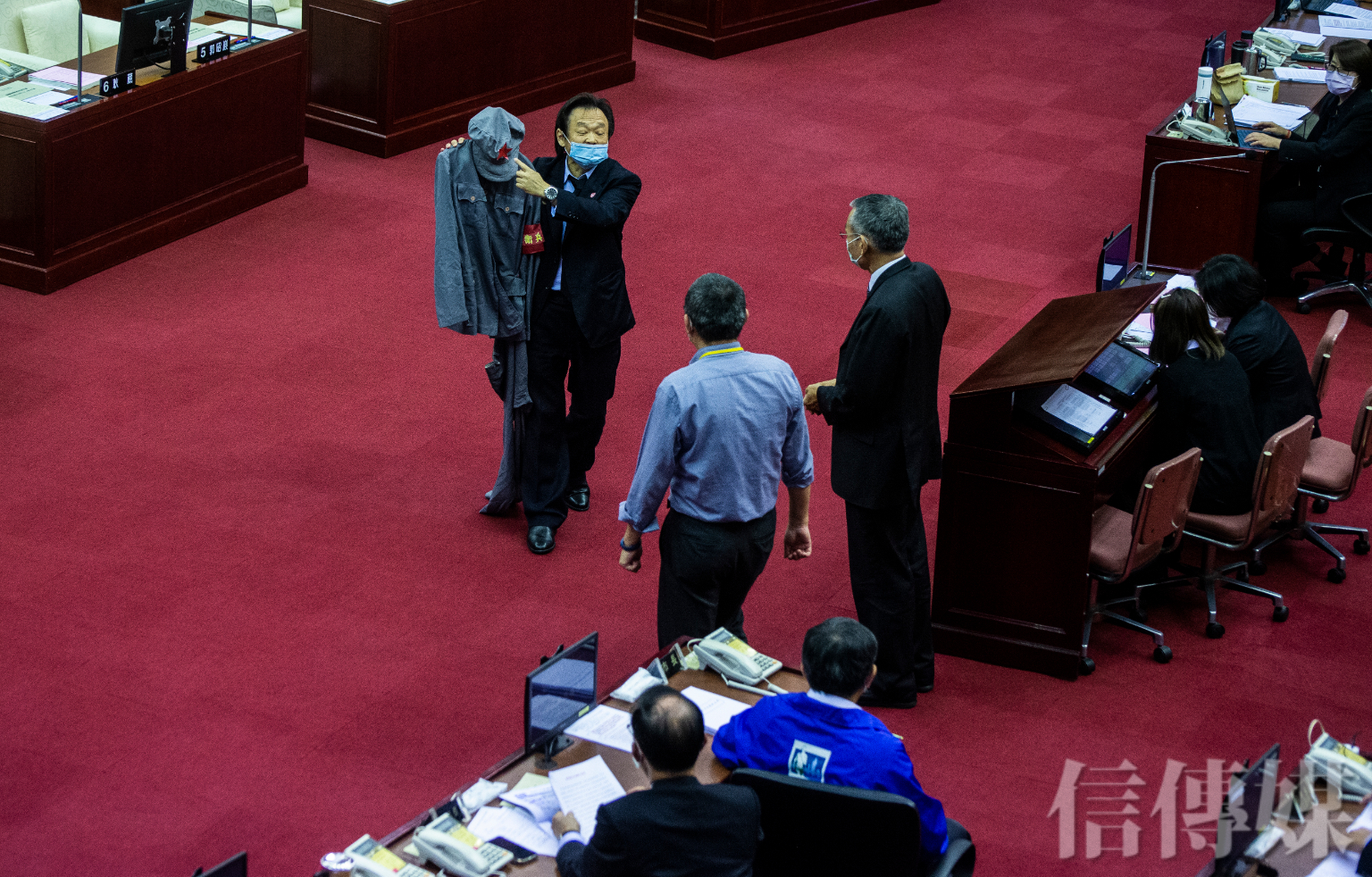 王世堅酸,中國共產黨在抗日戰爭時,一分抗戰、兩分應付、七分發展,而現在的柯文哲、民眾黨「一分抗疫、兩分市政、七分發展」,柯文哲跟中共真的異曲同工,從「兩岸一家親」進階到「兩黨一家親」,所以特別準備毛裝,並在議場時上前遞給柯文哲,「柯市長,你就笑納吧」。