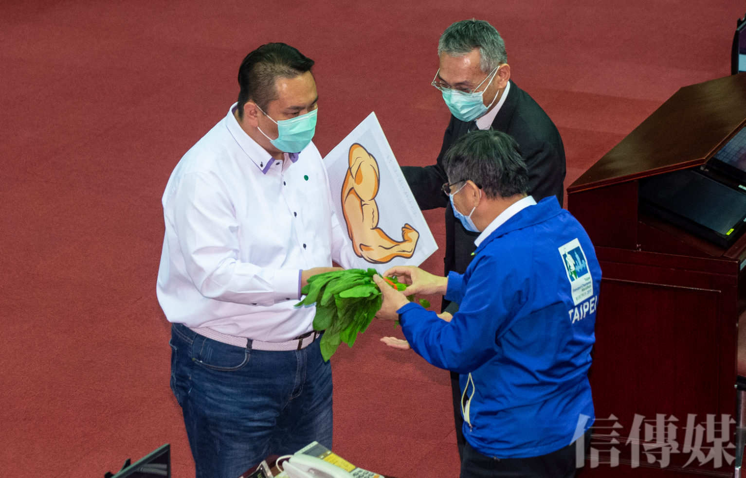 國民黨市議員陳重文指出,這次的市政報告,沒提到紓困方案,北市府提出的9大紓困方案,好像自認沒問題,但很多可憐的防疫人員,包括警察、消防隊員、環保消毒人員、健康中心人員等,中央未納入補貼,而陳重文則準備了菠菜,希望柯文哲能夠硬起來,在防疫期間,應該為當前線警消人員向中央爭取應有的補助經費。