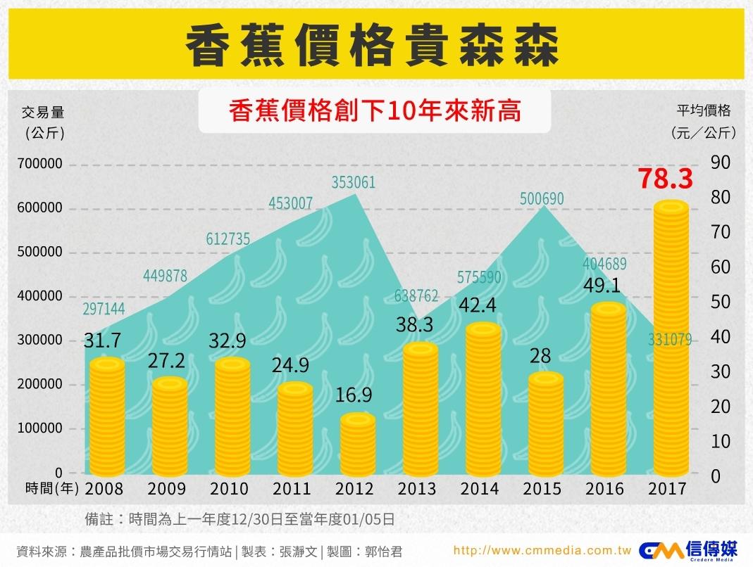 從近十年來、同一時期交易記錄來看,過去在冬天的這個時候,香蕉每公斤平均批發價大約落在30元上下,最低落在2012年的16.9元,不過從2015年年底開始,香蕉價格一路開始走揚到49.1元,今年元旦一過,香蕉每公斤平均批發價格更飆上78.3元,創下近10來新高水準,不過交易量卻也是創下10年新低。