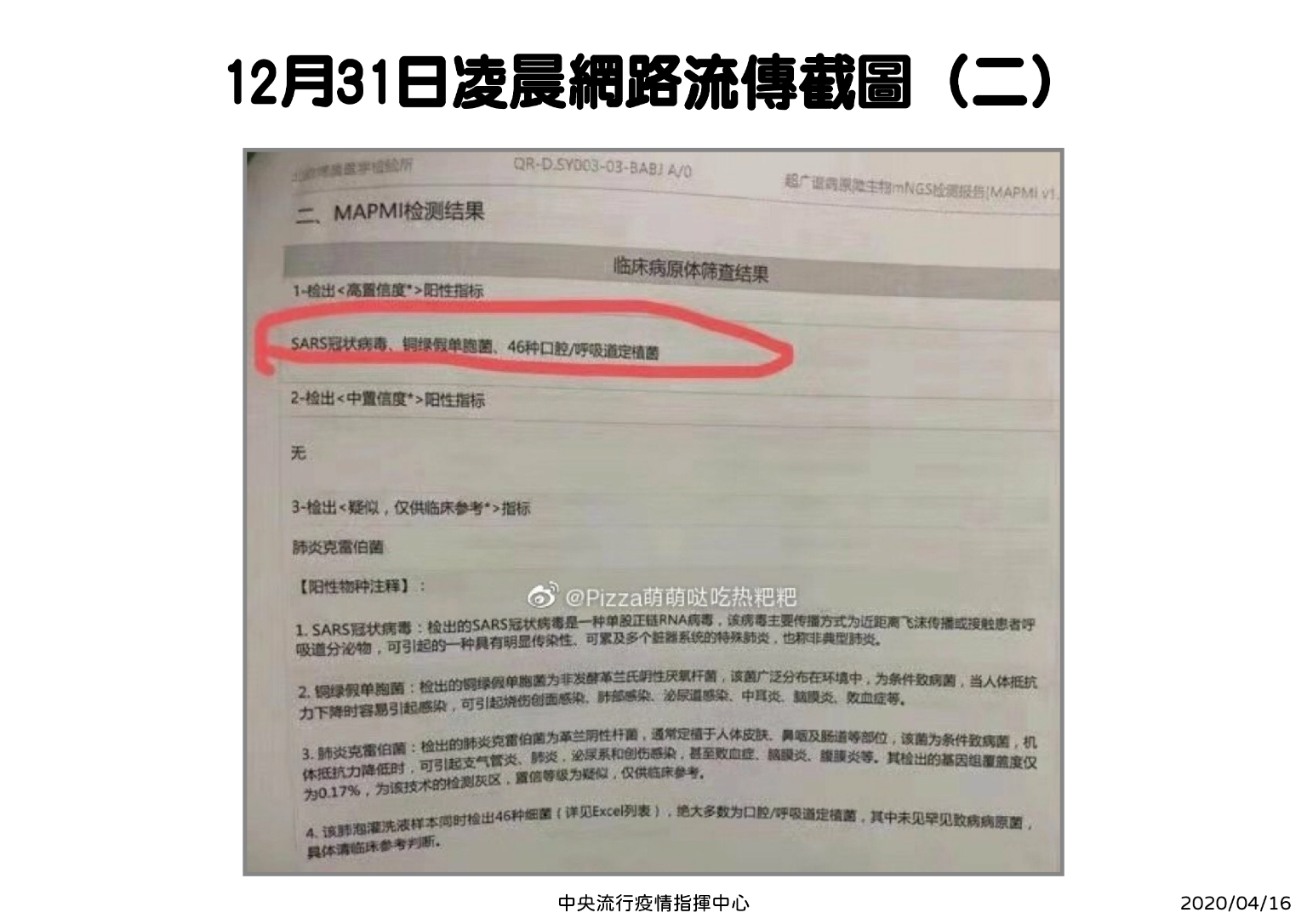 他表示,有些病原體驗到不見得是致病的,但看到SARS他直覺認為這個病毒可能是致病性很高的病原體,「只是這個檢驗報告並沒有寫檢驗日期,也沒有蓋官方的戳章,所以這個圖研判可能是醫院的醫師拿到報告後,就順手用手機拍了照片發出來。」