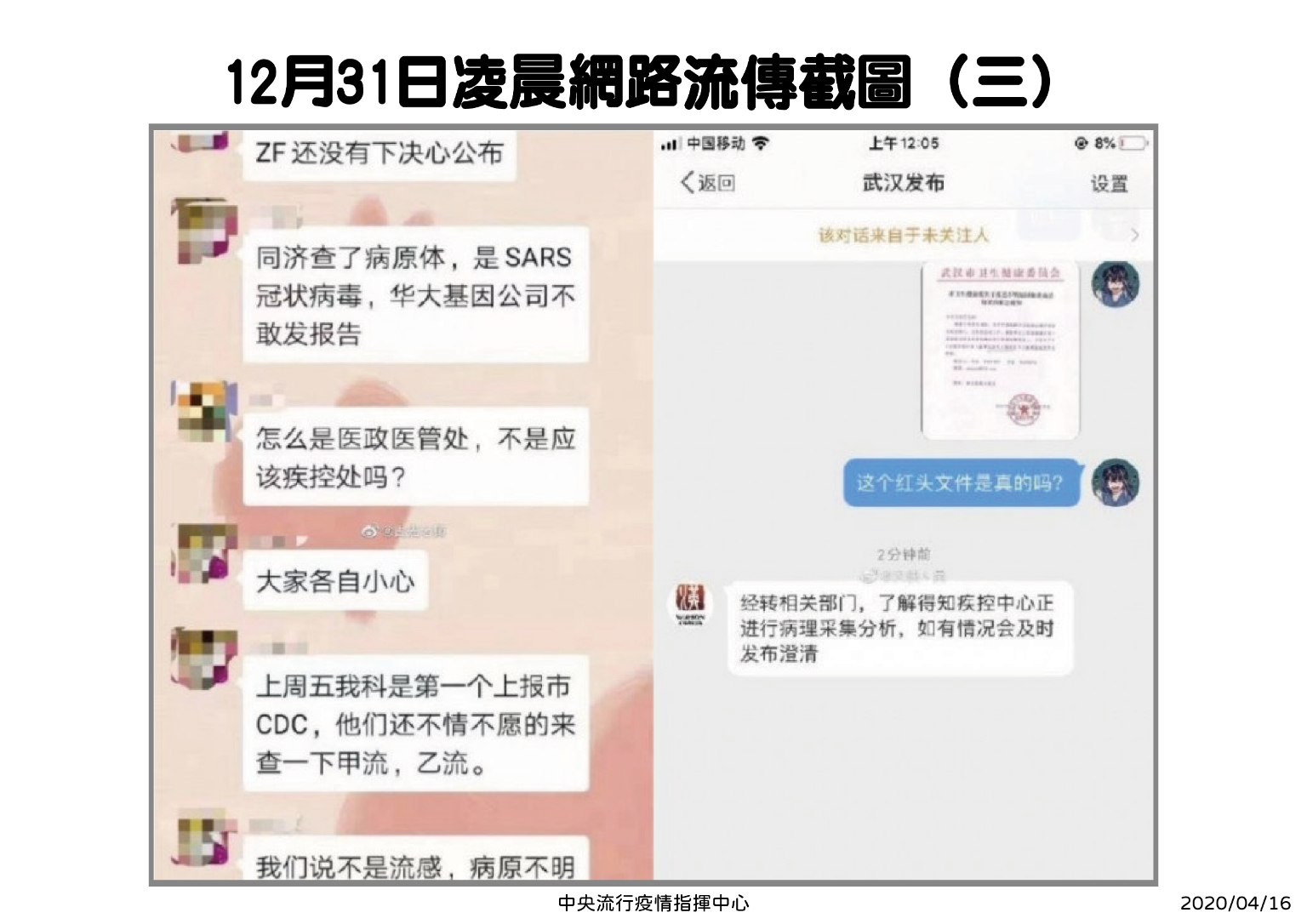 除了PPT上的資訊,羅一鈞也再去找了相關外流出來的訊息,並發現在其他微信醫療群組也討論在醫院裡面發生的實際狀況,「從這幾個點研判可能真的有一個院內的群聚在發生,而且大家擔心有感控上面的疑慮需要隔離,還要注意自身安全等等,當醫護人員這樣提醒,其實就要擔心是否有院內醫護人員相互感染的狀況發生。」