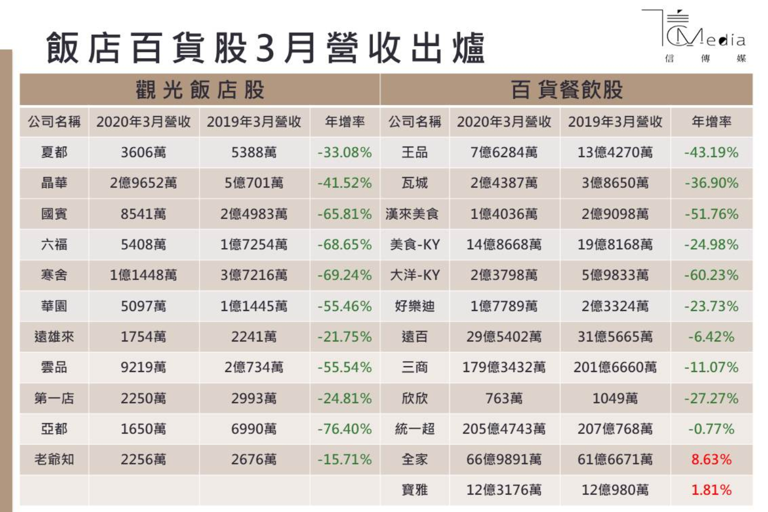 除此之外,受到國際觀光客及商務客驟減,飯店業者也同樣難敵疫情衝擊。國內飯店業龍頭晶華3月營收年減41.52%,在飯店股當中不算最差,像是亞都年減76.4%,國賓、六福、寒舍皆年減超過60%,華園、雲品也同樣年減達5成以上,更慘的是,10家飯店3個月營收總和還抵不上全家便利。