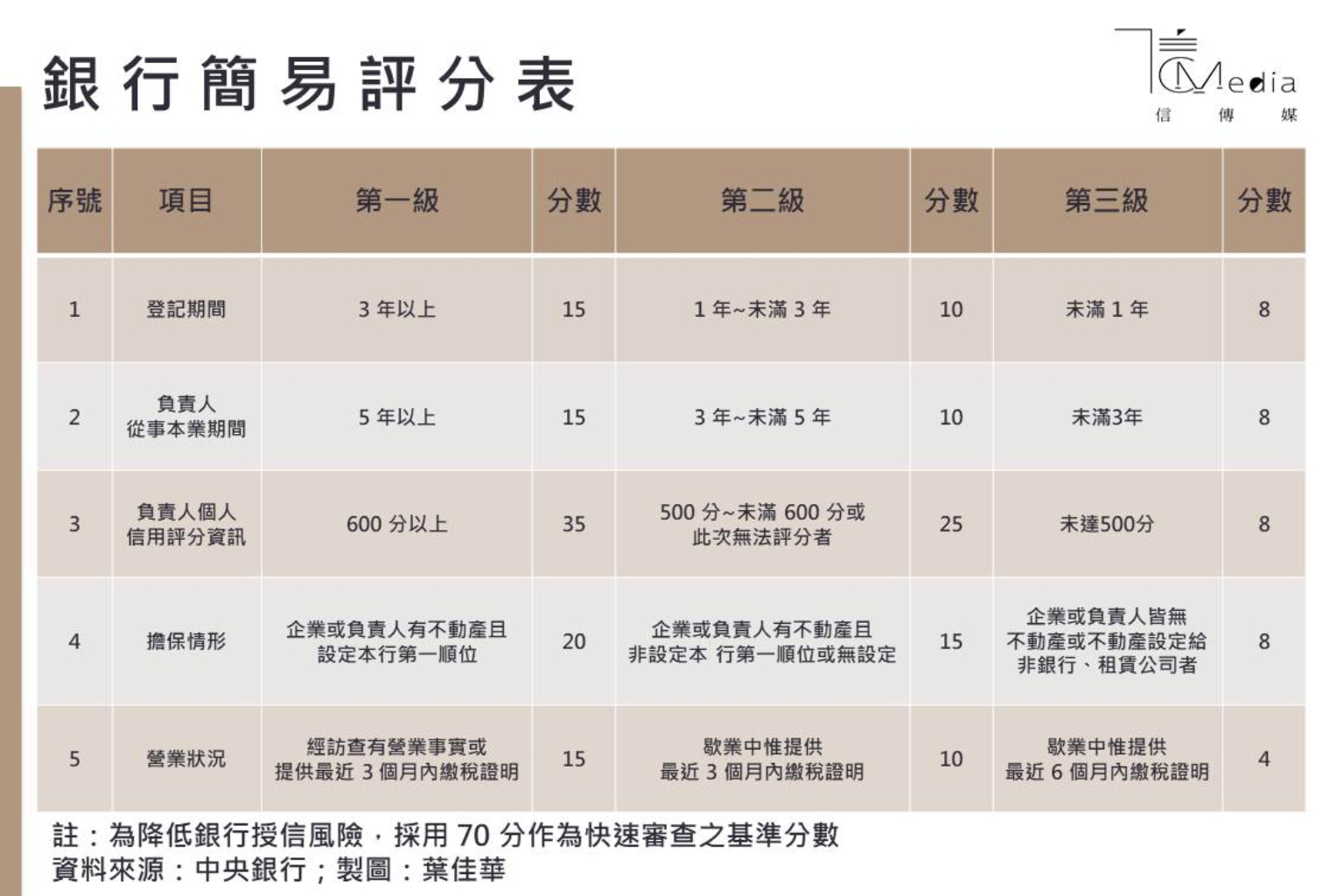 而比較特別的是,此次針對小規模營業人貸款方案,銀行與中小企業信保基金也共同擬定銀行簡易評分表,設定5個項目計出總分,包括登記時間、負責人從事本業期間、負責人個人信用評分資訊、擔保情形、營業狀況,只要達到70分,銀行就會核貸,以加速簡化核貸流程。