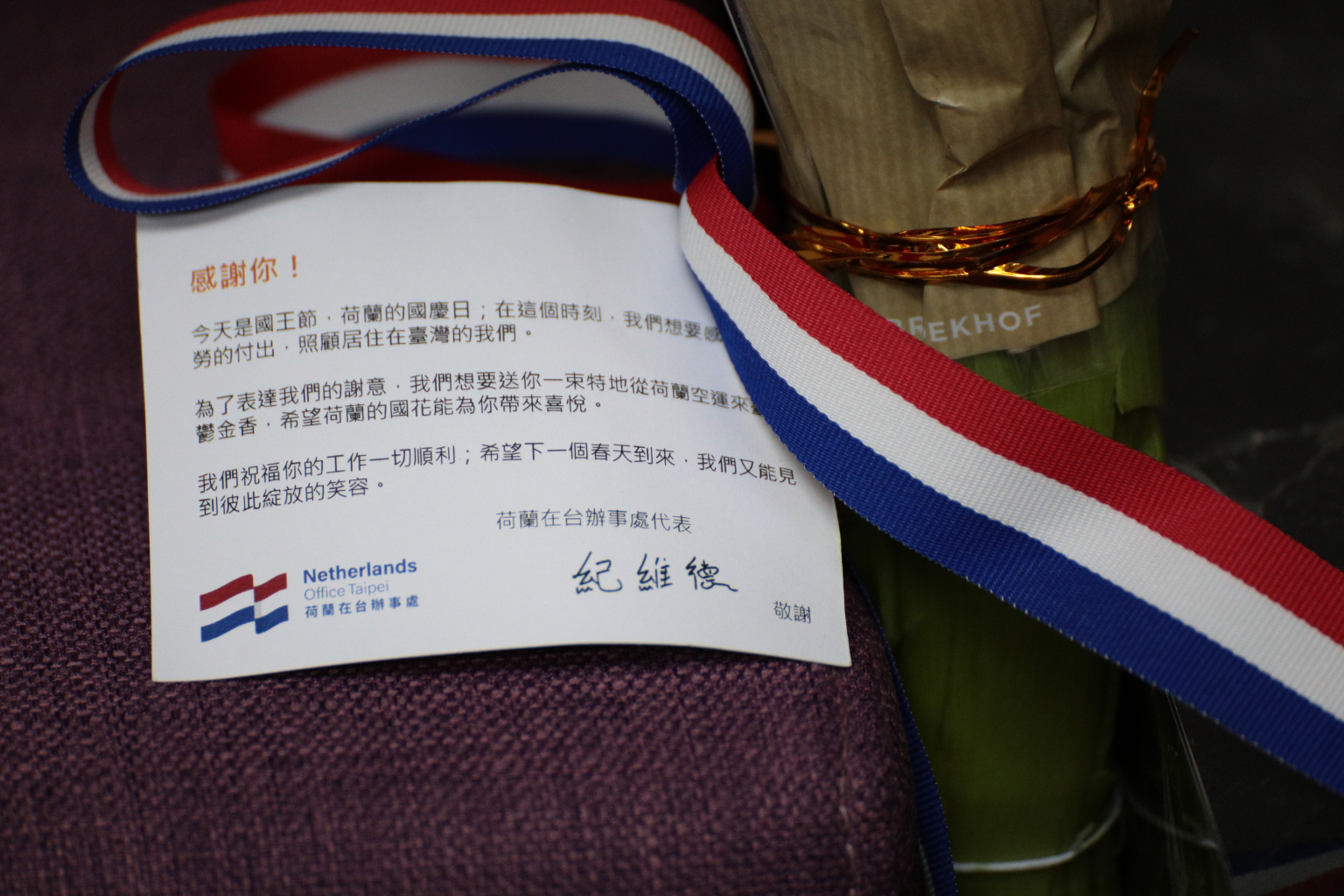 荷蘭貿易暨投資辦事處今天在臉書粉絲團上表示,全球疫情嚴峻,今年度荷蘭國慶將不如以往慶祝,更準備了3,999朵橘色的荷蘭國花鬱金香送來台灣,除了拜訪外交部長吳釗燮,也由辦事處代表及同仁親手將鬱金香綁上荷蘭國旗三色的緞帶和特製卡片,搭配焦糖煎餅送至疫情指揮中心、指定收治重症患者與部分市轄醫院,以及桃園國際機場等29個單位。