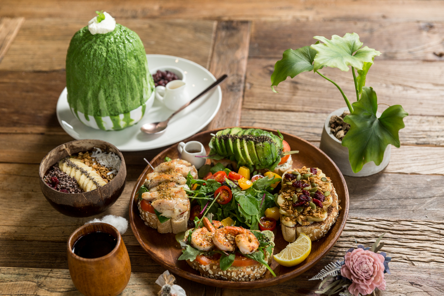 店家以婚禮佈置、花藝課程為主,在韓國旅遊偶然吃到韓式冰酥,決定把這道創意甜品帶進台灣,讓人在花店裡玩花也吃冰。手工製作的「冰酥」,層層碎冰手工夯實,外觀呈現半橢圓狀後,淋上特調醬汁,可愛又吸睛,春季主打「抹茶冰酥」,微苦抹茶醬搭配蜜紅豆、白玉湯圓,加點煉乳的滋味更棒。「開放三明治」選用五穀雜糧麵包,鋪上雞肉、鮮蝦、酪梨或香蕉等口味,還有燕麥、奇亞籽、巧克力酥片、蔓越梅果乾跟水果組成的「果昔碗」,也是愜意午後不能錯過的選擇。