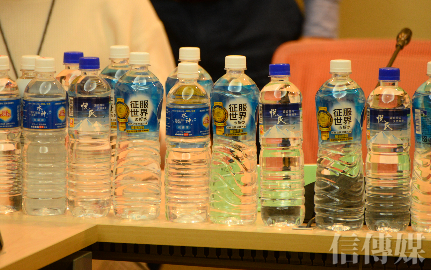 記者會現場一字排的礦泉水瓶,吳玉琴指出,這些送給各地方政府的次氯酸水,包裝太像一般6百cc的包裝礦泉水,容易造成民眾誤食。(攝影/趙世勳)