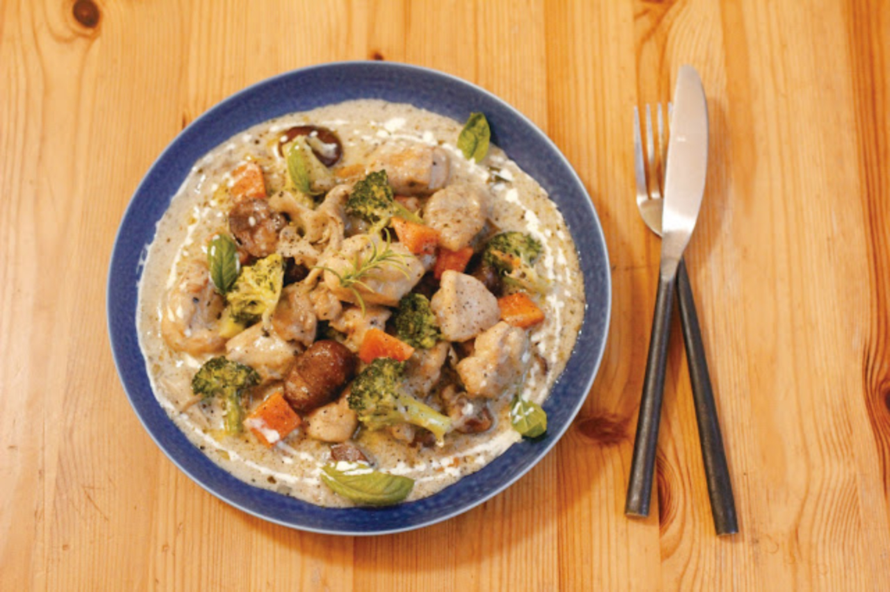 聊著聊著也到了傍晚,江舟航開始為我們準備心目中的秋季好食,分別是和帶以香橙為基調的乳酪蛋糕和鹹食野菇栗子燉雞肉,他做菜的時候很安靜,將自己完全投入料理的世界,空氣裡只剩下我們喀擦喀擦的拍照聲,時間滴答過去,多層次的香味席捲鼻息,「好香。」肚子餓的叫聲有些猖狂,且當是給料理者最好的回應,時針溜過了薄暮來到了晚餐時間,爐中的燉汁啵啵啵像首進入尾聲的交響樂,由一個清脆的關火聲畫下休止符。肚子餓了,吃飯吧!