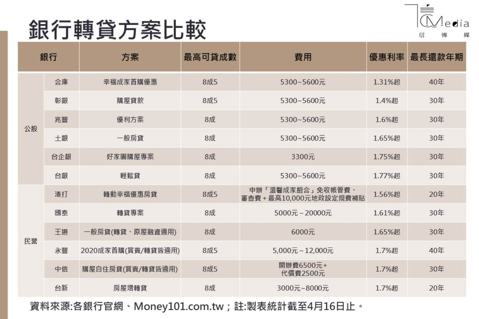台灣央行在今年3月中宣布降息1碼後,各家銀行也跟隨著央行腳步,調降房貸指標利率1碼,尤其,為了配合行政院擴大紓困,公股銀行更全面將貸款1千萬元以下額度的自用住宅房貸利率大減2碼(其中1碼享半年期優惠從4月1日至9月30日),利率可說是殺到見骨,吸引房貸族考慮讓房貸「搬家」,轉貸尋求更低的房貸利率。