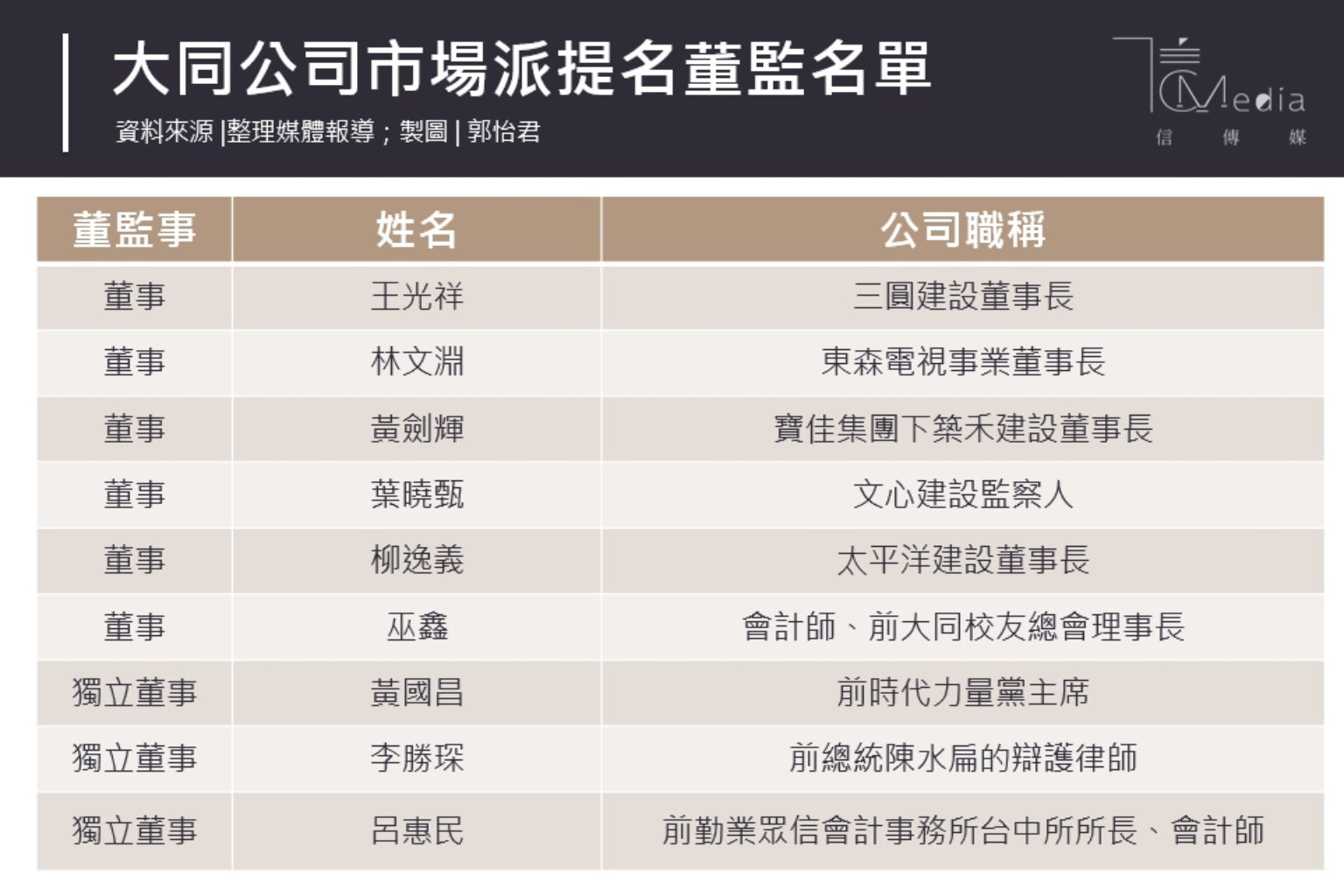 大同市場派被曝光的9席董事名單中,6席董事分別是:蔡英文總統的表哥三圓建設董事長王光祥、東森電視事業董事長林文淵、築禾建設董事長黃劍輝、文心建設董事長葉明進的女兒葉曉甄、太平洋建設董事長柳逸義,和會計師巫鑫。