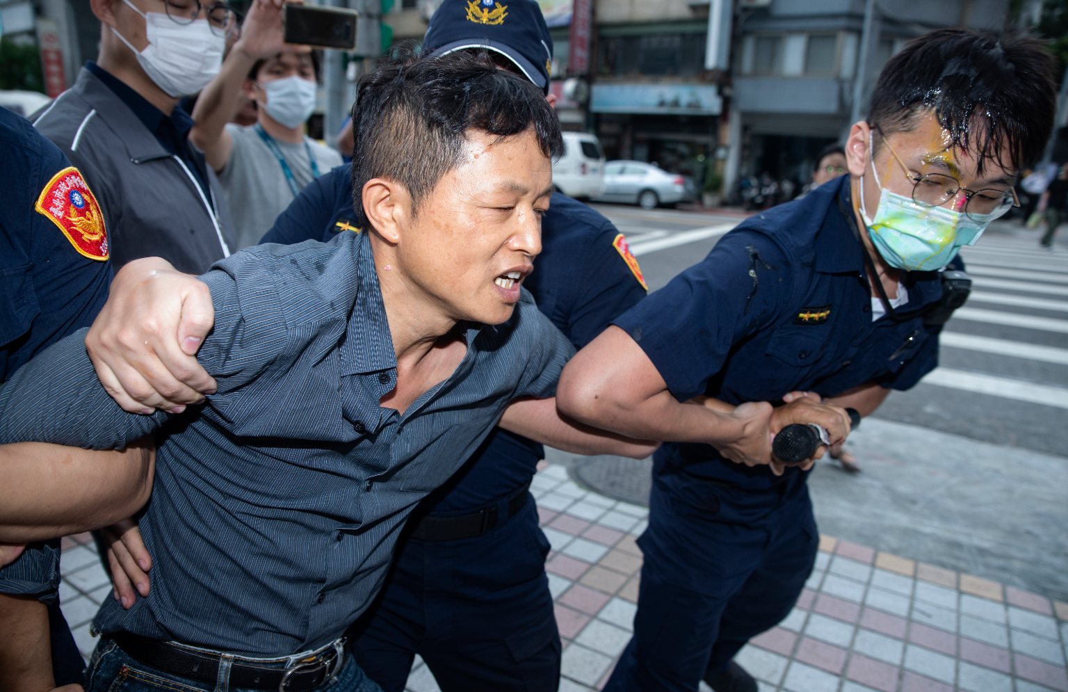 台灣國主任陳峻涵(左)向中央黨部丟擲雞蛋,波及現場警員。(攝影/趙世勳)