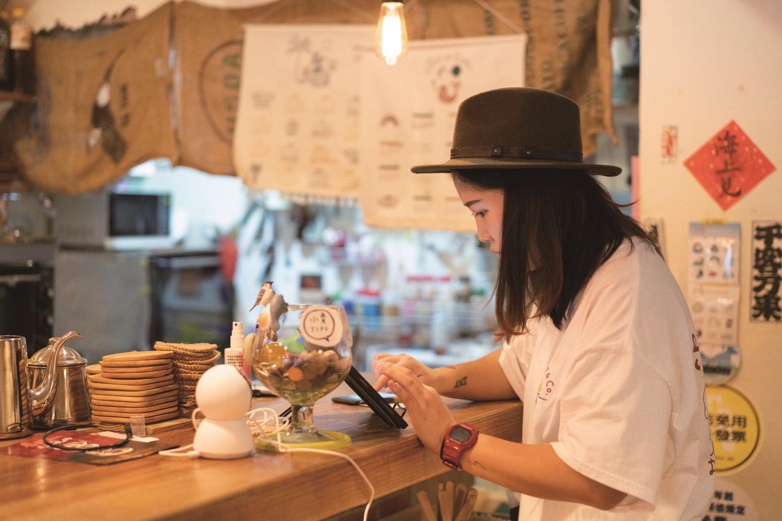 下午3 點,開燈咖啡準時拉開鐵門, 此時的咖啡館還不是城市的主旋律,入座的客人以學生、業務和自由工作者居多,氣氛悠閒,不用忙於接待客人,兩人也有時間做點別的事。
