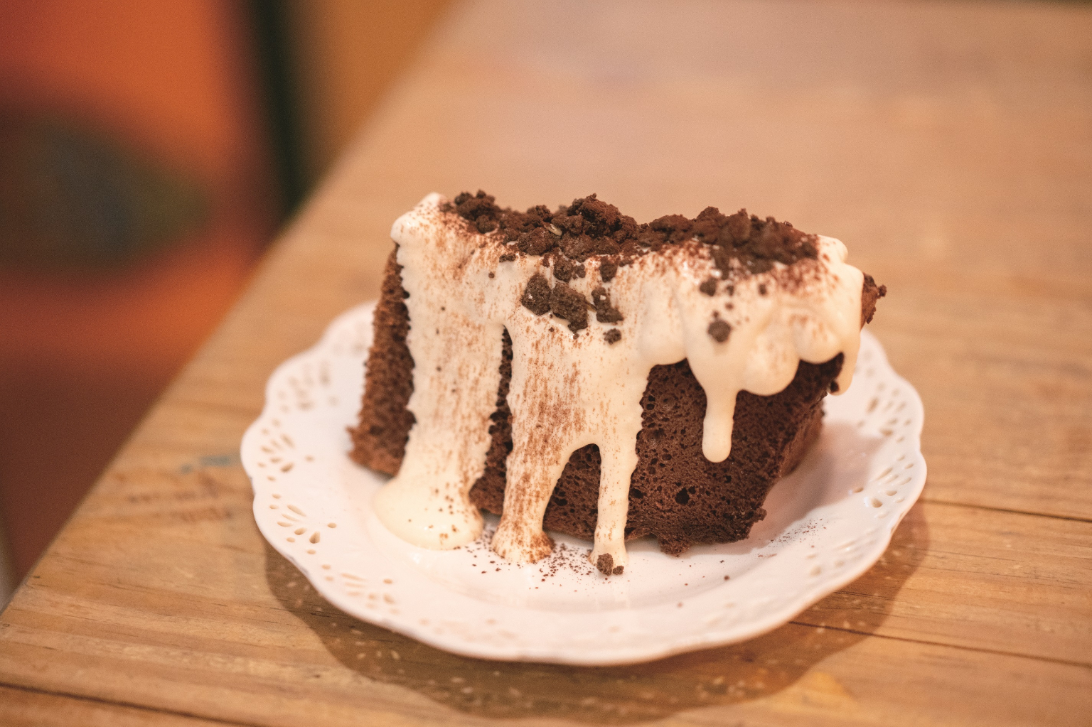 早期的咖啡館,蛋糕多半由中央廚房製作送來,上餐時還殘留著退冰的水氣;阿咪說,現在的客人跟過去不同,不只要好咖啡,還要有特色的餐點、精緻的擺盤,拍照打卡才有看點。開燈咖啡不走網紅店路線,卻也有期間限定的餐食菜單。「最近有特別去上烹飪課,巧克力戚風蛋糕是我近期的得意作品!」阿咪興奮地說。不只是蛋糕體要拿捏好烘烤火候,才能蓬鬆得恰到好處,糕體上的生奶油調有威士忌,微醺微甜,搭在一起嘗起來剛剛好。