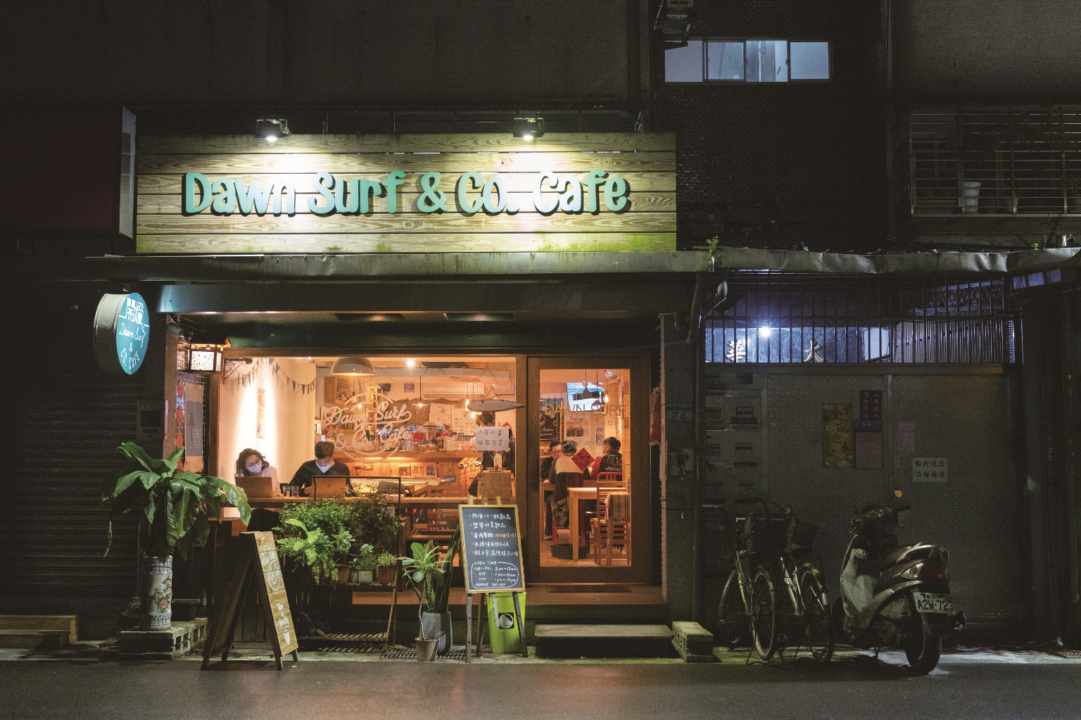 一間咖啡館,兩道自由的靈魂,曾經在沒日沒夜的工作裡失去平衡,為了保有生活,從起初營業至凌晨3點,改至凌晨12點,依舊是左右鄰里中最晚熄滅的一盞燈。早上偶爾衝浪、偶爾沖杯咖啡給自己,同時作為日常練習,保有一點自己的生活,晚上也才有餘力為台北夜貓族打造心靈避難所。