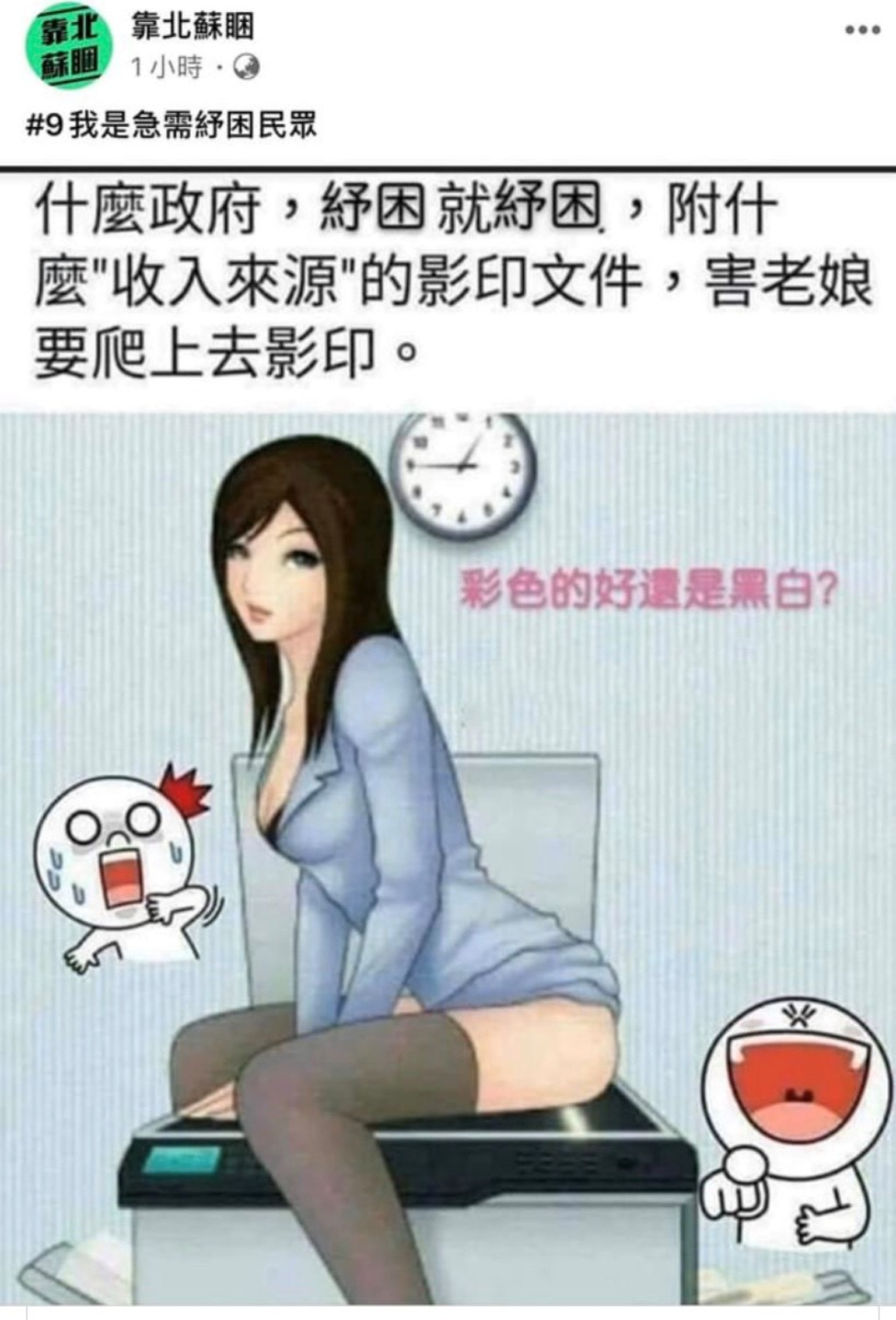 不料,昨日他選出一則圖文,裡頭一位OL(上班女性),跨坐在影印機上,並批評政府稱:「紓困就紓困,附什麼收入來源的影印文件,害老娘要爬上去影印。」該文一出立即被網友截圖,痛批貶低女性,甚至罵簡勤佑是「數位豬哥亮」。