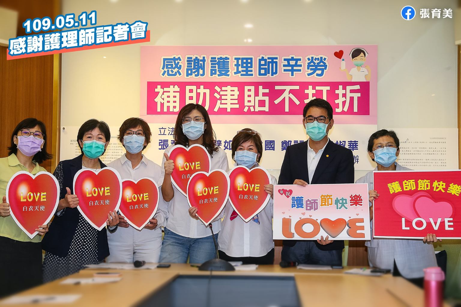 就在接受《信傳媒》專訪的這一天,張育美領銜舉辦「感謝護理師辛勞,補助津貼不打折」記者會,民進黨、民眾黨、時代力量等各朝野黨團都有立委出席。