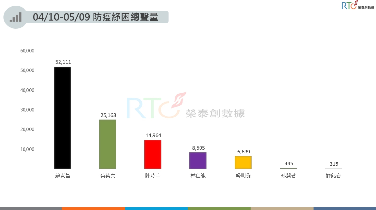 根據《信傳媒》與《榮泰創數據》的合作資料顯示,在4月10到5月9日這一個月來,蘇貞昌的總聲量達5萬筆以上,是所有政府高層及閣員之最,佔全體聲量的48.3%,其中,負面聲量達37%,正面評價僅5%。但蘇貞昌上周剛獲蔡英文繼續任命為閣揆,顯然「紓困」任務還要由蘇揆執行與善後。