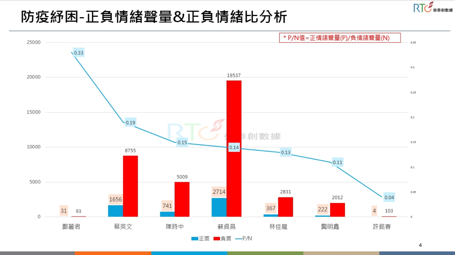 根據榮泰創數據的統計,蔡英文4月上旬被報導她「宅在家愛貓看職棒,並強調體育署的運動產業紓困振興方案」,網路正評極高,顯然應有獲得寵物族與職棒迷的青睞。至於蘇貞昌的正面聲量比例都不高,「萬元紓困之亂」時,好評不到2成;陳時中也被這波亂象掃到颱風尾。
