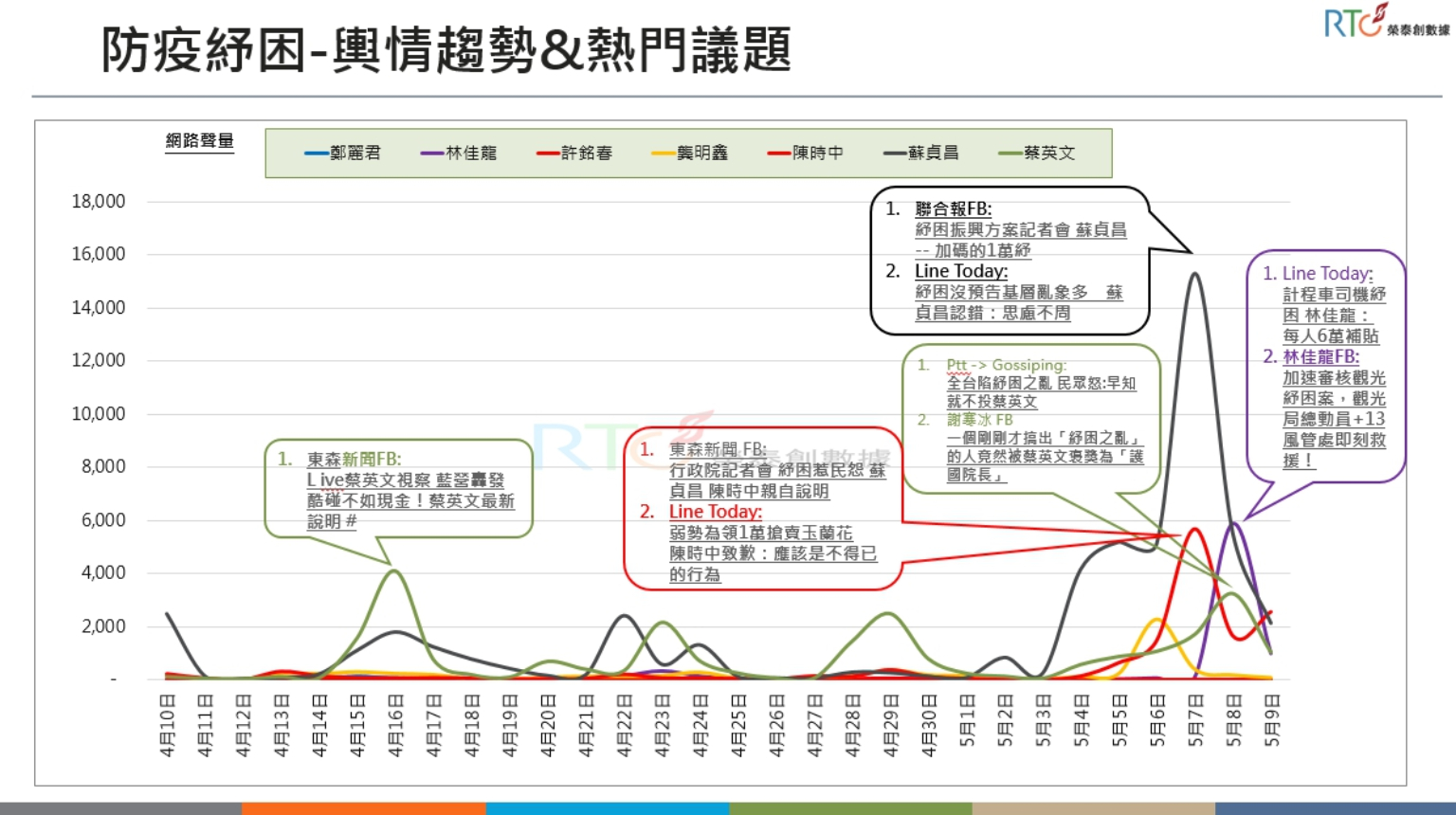 進一步分析,蔡政府的高聲量都集中在5月初,尤其是紓困方案加碼一萬元沒有預告,申請手續繁複導致的民怨,讓蘇貞昌一天之內聲量上竄15000則以上,一則ptt的貼文:「全台陷紓困之亂,民眾怒:早知道就不投蔡英文」,以及泛藍名嘴謝寒冰的臉書貼文:「一個剛剛才搞出『紓困之亂』的人竟然被蔡英文褒獎為『護國院長』」,也引起一些迴響。