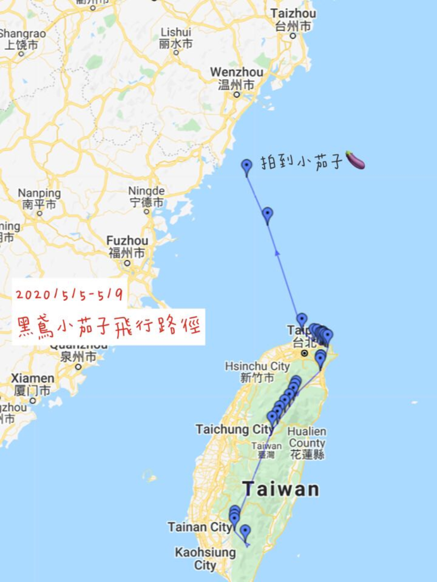 就在野放後1週,研究團隊5月5日記錄到小茄子直接從屏東霧台飛往宜蘭雪隧山上,單日飛行達260公里,途中更直接從台七甲線穿越中央山脈、橫越2500公尺稜線,飛行距離及高度均打破國內觀察紀錄,讓研究團隊大為振奮。隔天小茄子沿北海岸飛往基隆港,在基隆休息2天,5月8日上午再從富貴角燈塔出海北飛,跨海飛行200多公里,於下午5點抵達中國溫州外海某處無人島,10日再度啟程進入中國境內。