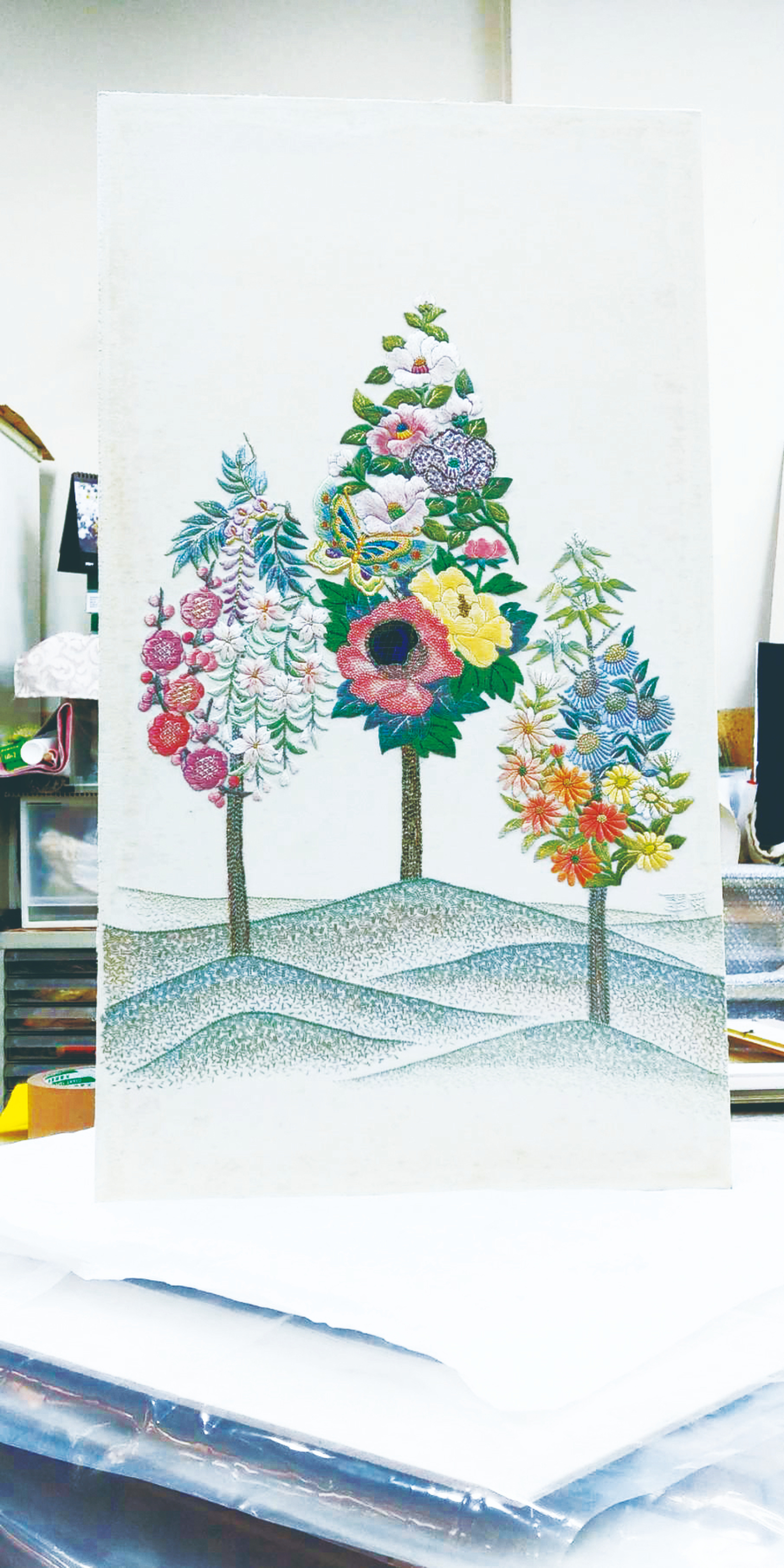 刺繡的針法千變萬化,所呈現的瑰麗世界值得令人探究,也因此讓她從一開始的抗拒,到後來花時間精進刺繡技法,研究線材變化,甚至代表公司到日本進行技術交流,而一針一線之間,也為劉老師的技藝奠定了基礎。
