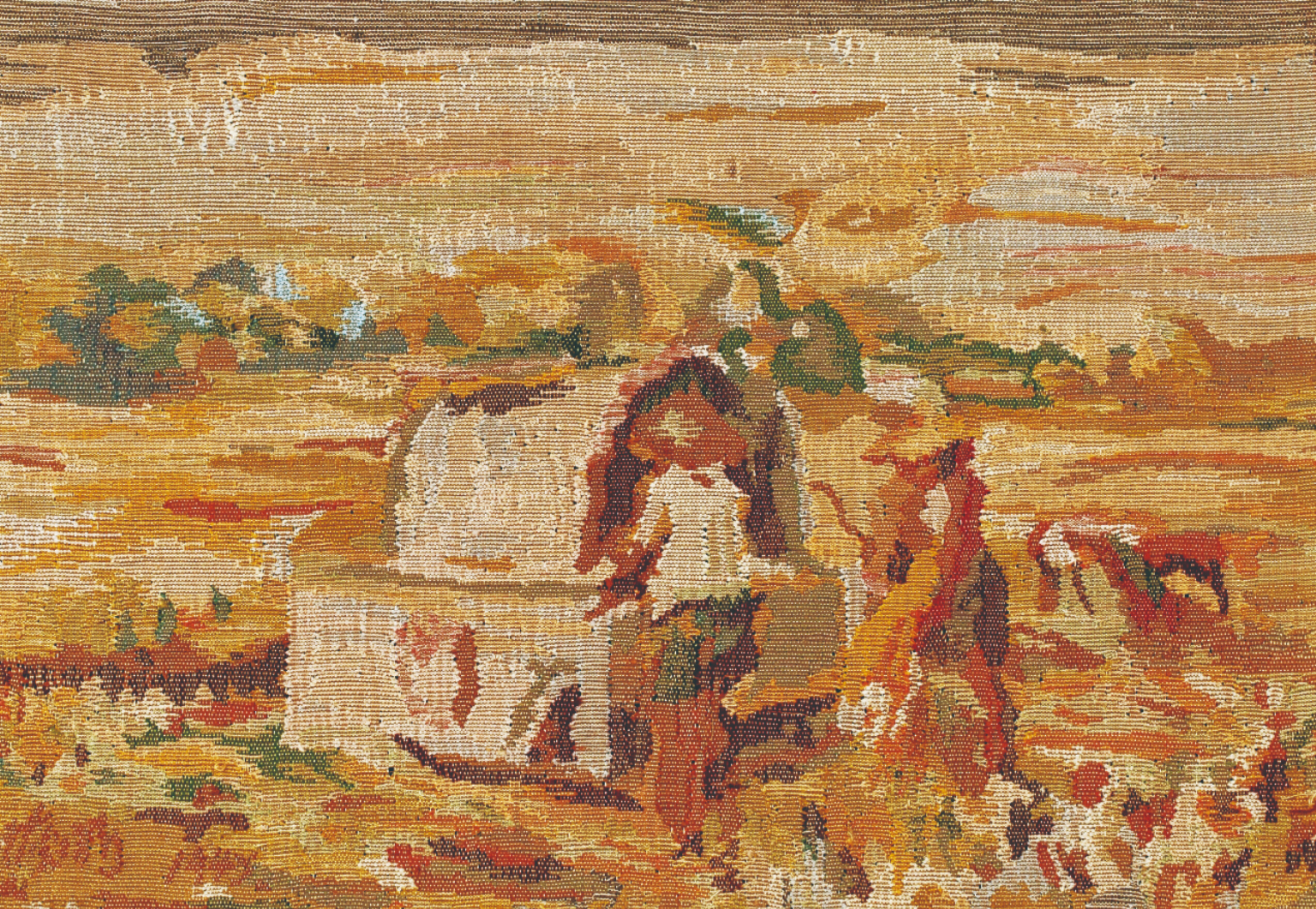 走進黃老師位在地下1樓的工作室,繽紛的繡線、數百簍的圖稿填滿櫃子,無一不述說著這些年的光陰歲月。「現在應該只有我有整套的設備。」黃老師一一介紹工具,小小的工作室卻包含了緙絲染織繡中好幾個流程,而桌上的作品每一幅都有其奧妙之處,像是以國立臺灣美術館典藏的林玉山〈蓮池〉為原稿,在黃老師的設計下,將畫作局部拆解,織成一席茶席,連在水面下的荷葉也若隱若現,甚至連落款也如出一轍,令人驚嘆。