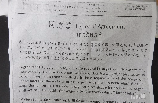 一例一休實施之後,手機大廠宏達電被控爆出第一起勞動契約爭議,桃園市電子產業工會7日前往宏達電桃園總部抗議,理事長趙建輝拿出影印的合約書指控,宏達電要員工簽下不平等的排假的同意書,規避加班費,「簽下去,生產旺季多的上班不算加班,淡季的時候不上班叫做休假,省去加班費。」