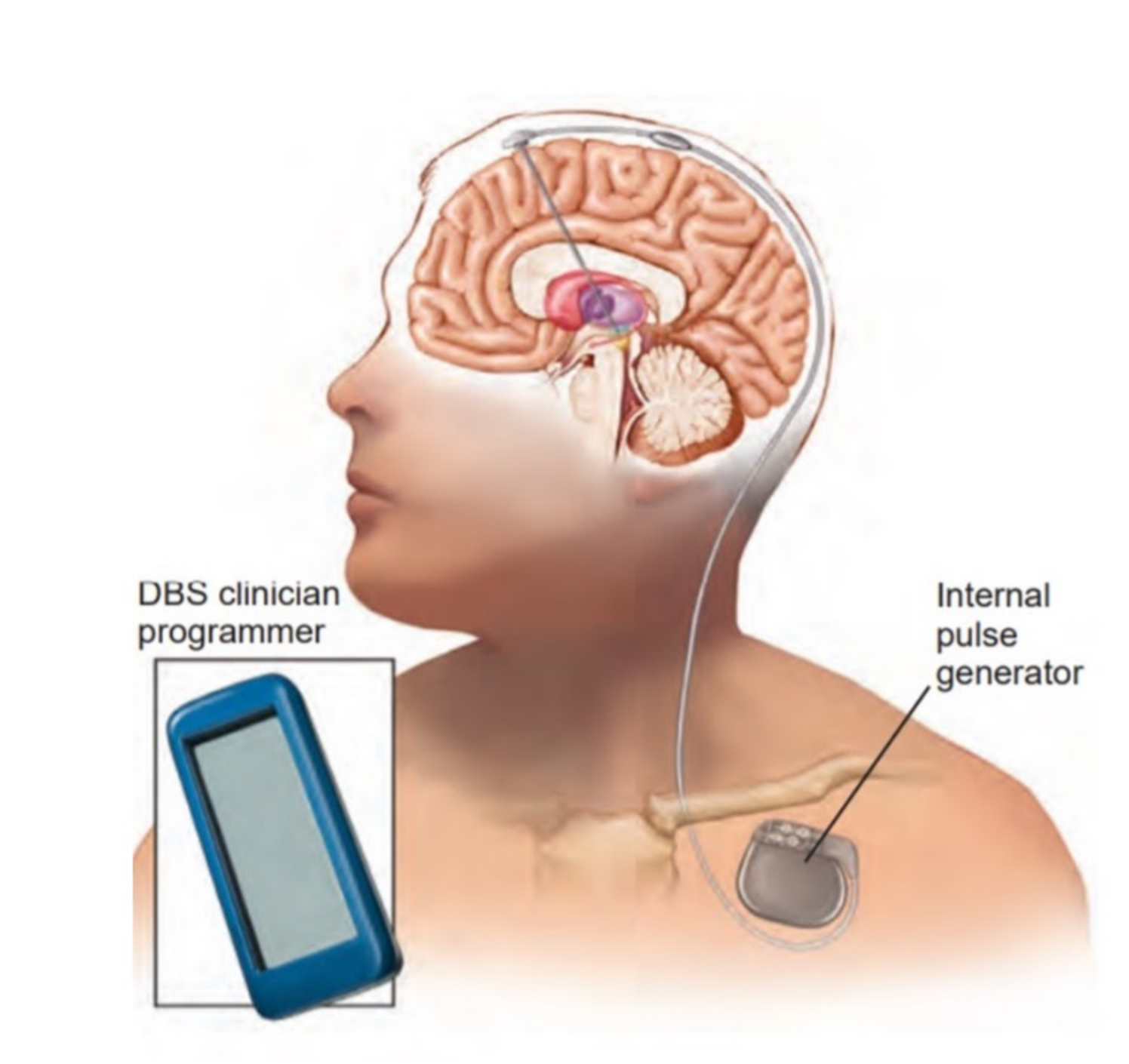 深腦刺激術:在腦中植入一細長電極導線,至丘腦下核或是蒼白球內核,此導線經皮下和胸前的脈衝產生器相連,藉著電流來調節腦內不正常的訊息,達到運動症狀的控制。