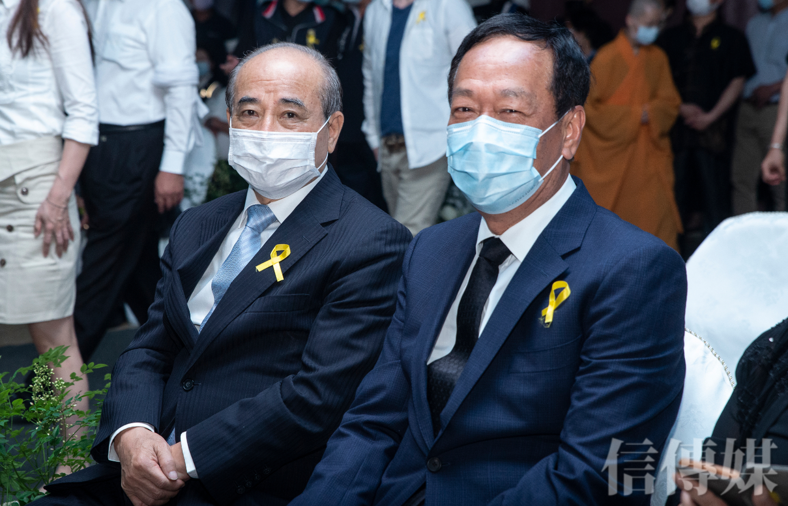 曾經和前省議長劉炳偉是老交情的前立法院長王金平(左)、前鴻海董事長郭台銘(右),兩人今日也到公祭現場致意。(攝影/趙世勳)