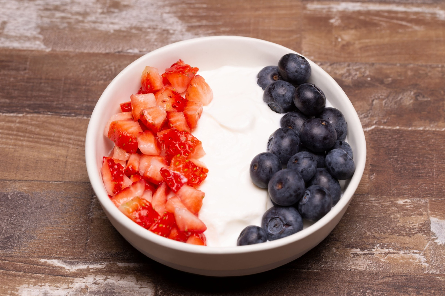 2.在希臘優格上撒上草莓和藍莓,即可享用。