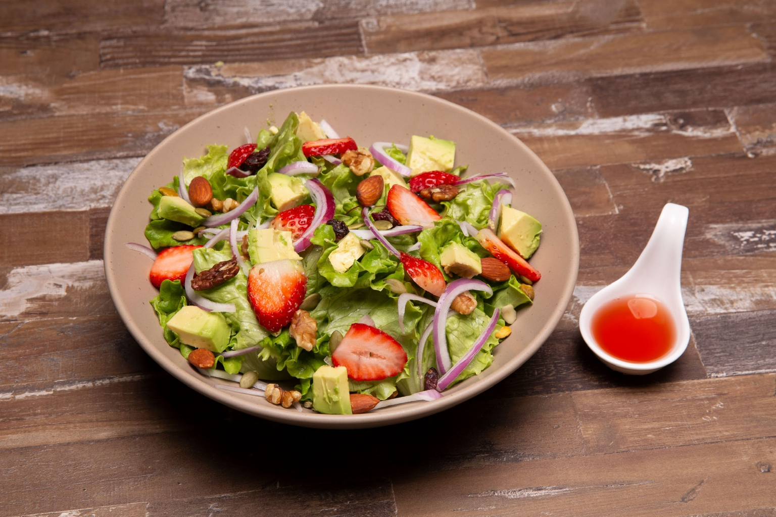 1.草莓、酪梨切丁,紫洋蔥切片,與綜合堅果、綜合蔬菜沙拉拌勻。
