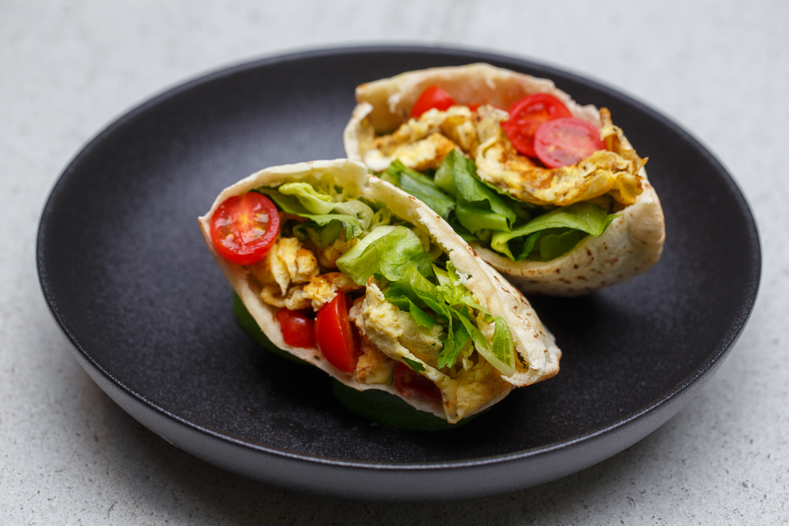 5.將番茄煎蛋與生菜置入pita餅中,即可食用。