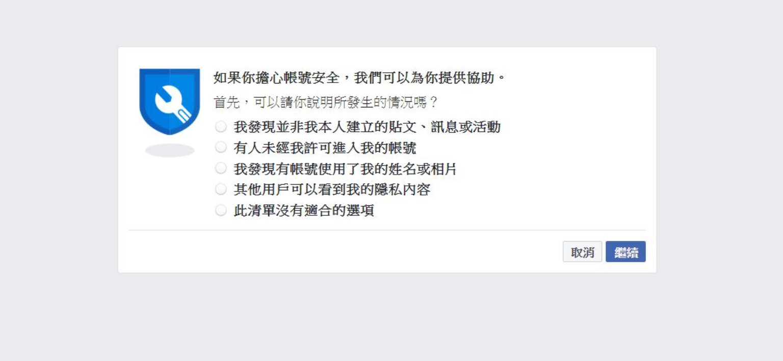 事實上,我國刑事局多年前和Facebook合作建立新的檢舉系統,當帳號被盜時,在未登入FB帳號前,可先進入https://www.facebook.com/hacked網頁(如下圖),依據接下來的問題提供能夠識別使用者帳號的資料,像是輸入電子郵件、電話或Facebook用戶名稱,或也可輸入自己和朋友的姓名。
