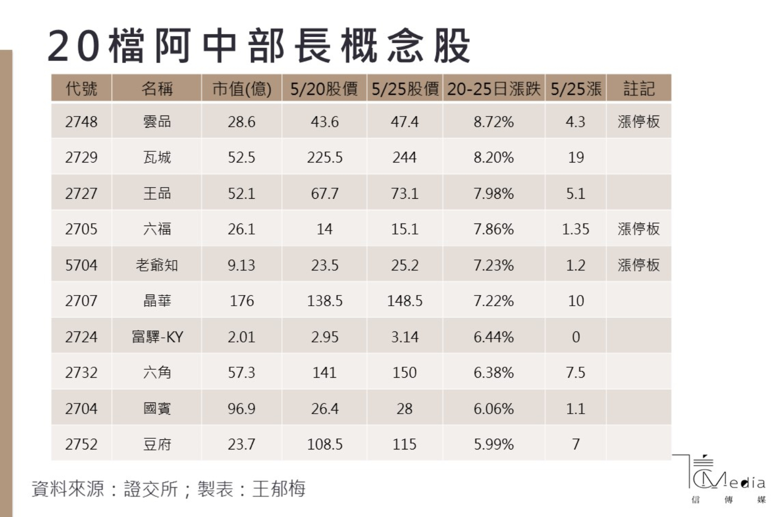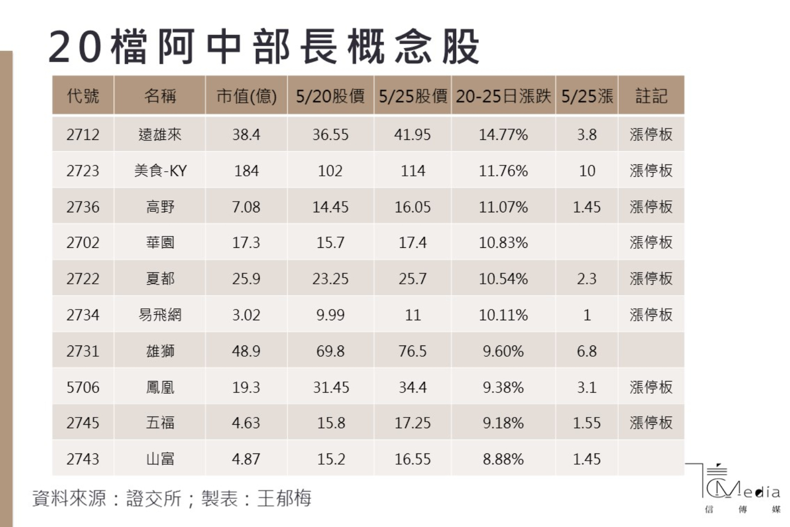 觀光股在衛福部的墾丁之旅後第一個交易日表態,包括夏都、遠雄來、美食-KY、高野、華園、易飛網、鳳凰、五福、六福、老爺知、雲品等11檔個股漲停板,其他雄獅旅行社、山富旅行社、瓦城、王品、晶華也有3%到7%的漲幅。