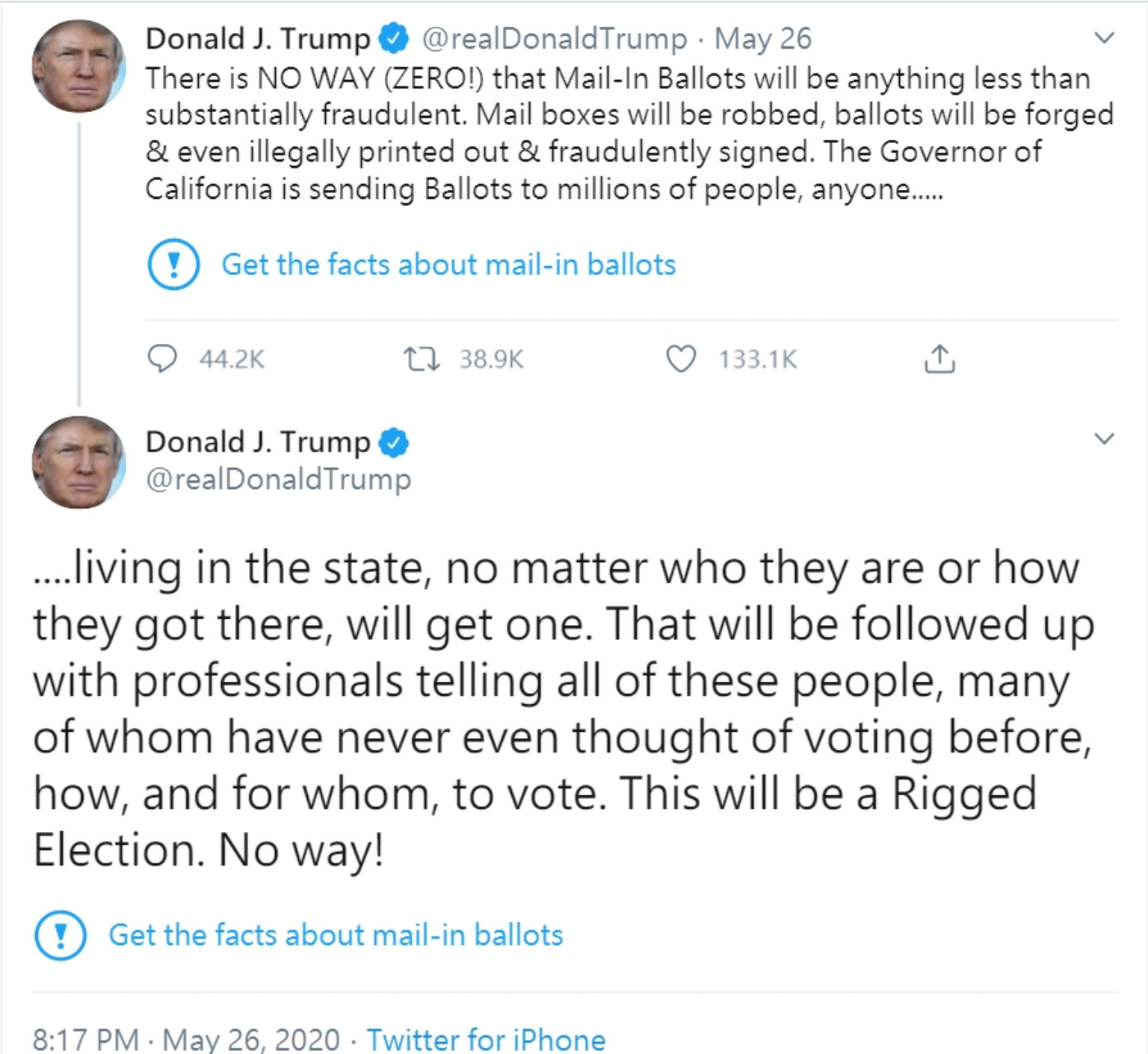 日前,推特破天荒對美國總統川普反對「郵寄投票」的2則推文標示「獲取有關郵寄郵票的事實」和連結,提醒讀者進行查證,意味川普的推文沒有根據,讓他大動肝火回擊又在發了2則推文表示,「推特正在干預2020的總統大選」、「推特完全扼殺言論自由,而我作為總統,將不允許它發生!」