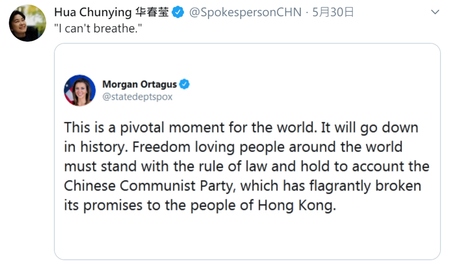 中國外交部發言人華春瑩在推特轉發美國國務院發言人歐塔加斯(Morgan Ortagus)呼籲眾人起而對抗中共的貼文,諷刺地加上一句「我不能呼吸了」,這是佛洛依德的遺言。