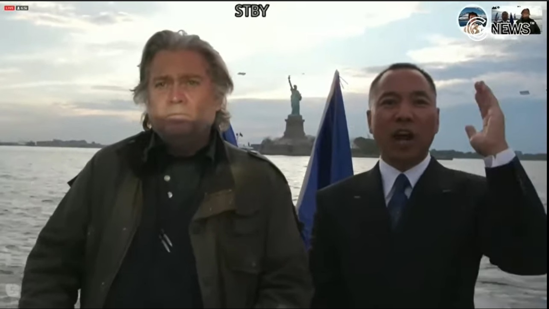 「今天是新中國聯邦的開國大典。」郭文貴所謂的新中國聯邦,是指郭文貴、班農等人成立的喜馬拉雅組織去催生、接受中國人民選出的政府,做為一個第三方機構,對新中國民主、自由法治、公正的監督,六月四日當天,即便紐約哈德遜河仍禁行,但當天在多架直升機、海上武裝船隻的保護下,他與班農在私人遊艇「Lady May」號駛向自由女神像,宣布新中國聯邦誕生。