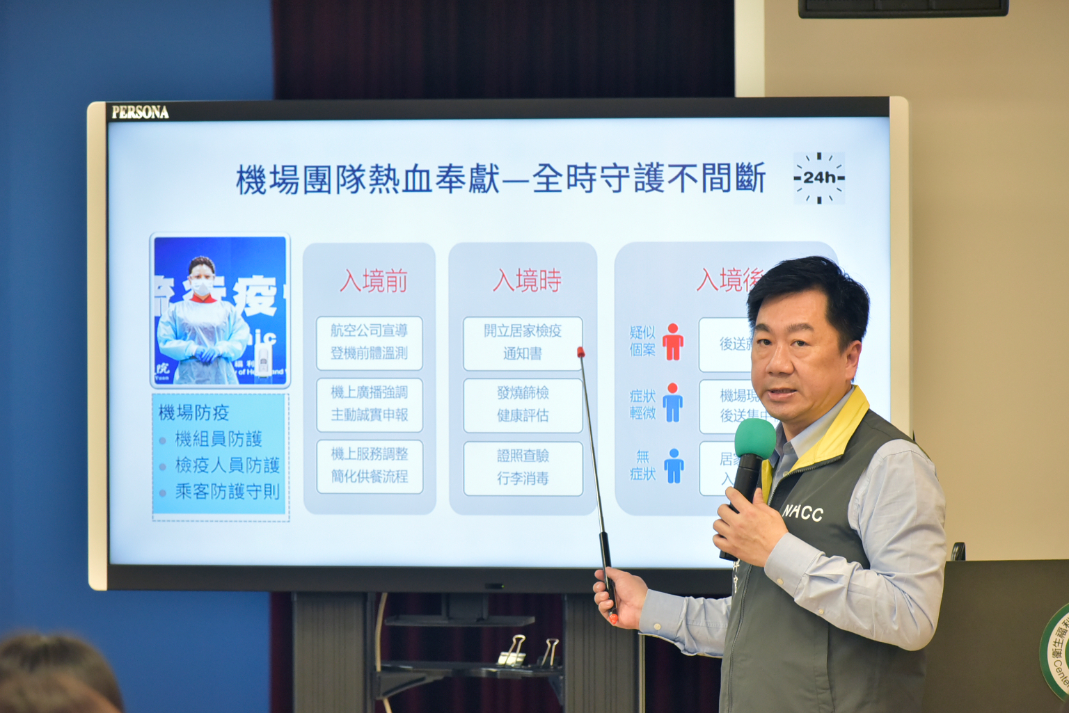 他提到在這次邊境防疫,從旅客下飛機開始,整個團隊各單位充分合作,機場也協助動線等支援,以及包括防疫車隊、防疫旅館的環境消毒、行李消毒,其他合作夥伴包括採檢醫護、護理志工、替代役男、保全人力、航空警察、港務警察、移民官員、檢疫人員等,都協助很多。