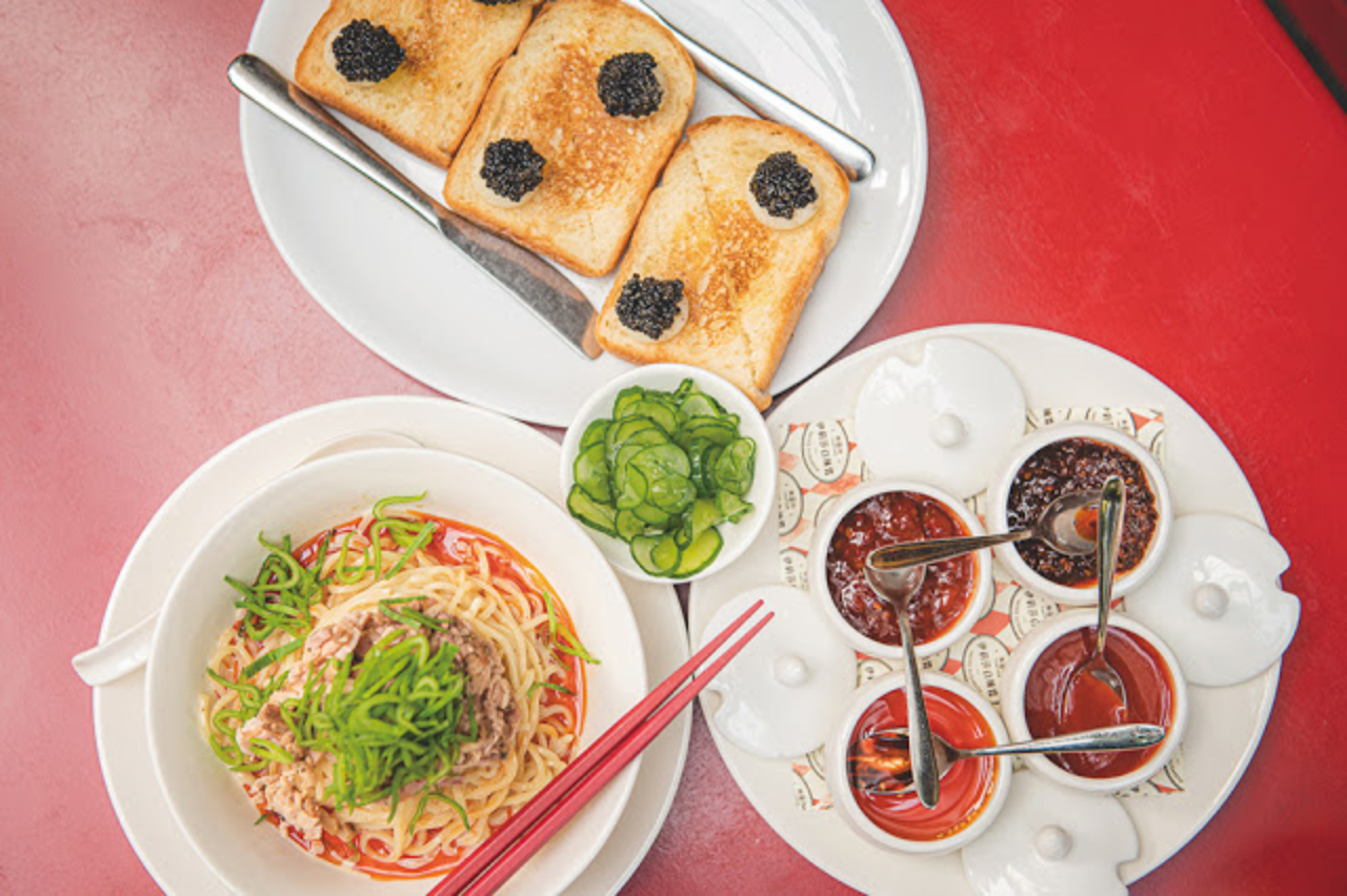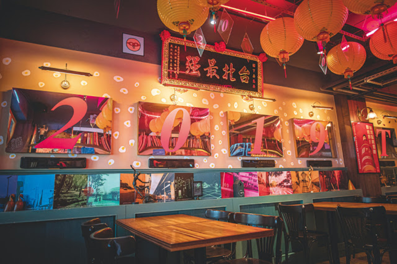 平時你或許是個可以用三角飯糰填胃的工作狂,但踏入《貓下去》,就是被這裡的奇特氛圍逼得想要好好吃飯、大口飲酒。寬敞的大空間裡,能見到美國俱樂部風格的吧台、台式磨石子地板、天花板還垂下幾個中式亮黃大燈籠、廁所區置放搞怪插畫圖文忠實表露出主理人的小反骨,延伸到餐點也是如此,在這可以吃到排骨飯、涼麵、燉飯、炸雞,融合了歐美日韓特色的台灣菜,是陳陸寬口中的台北精神。