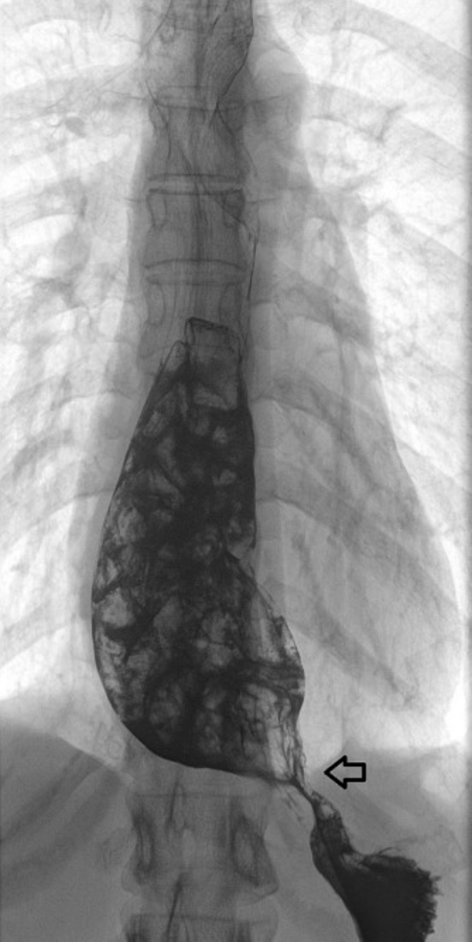 食道X光攝影呈現食道管腔擴大,賁門處呈「鳥嘴狀」狹窄,顯影劑不易流入胃內。而食道機能壓力檢查顯示在吞嚥時食道體從上到下呈同步收縮,賁門壓力高出正常值且吞嚥時舒張不完全,綜合以上檢查結果病人確定患有「食道賁門弛緩不能症」。病人於2009年接受左側開胸食道肌肉切開暨抗逆流手術,得到良好改善。