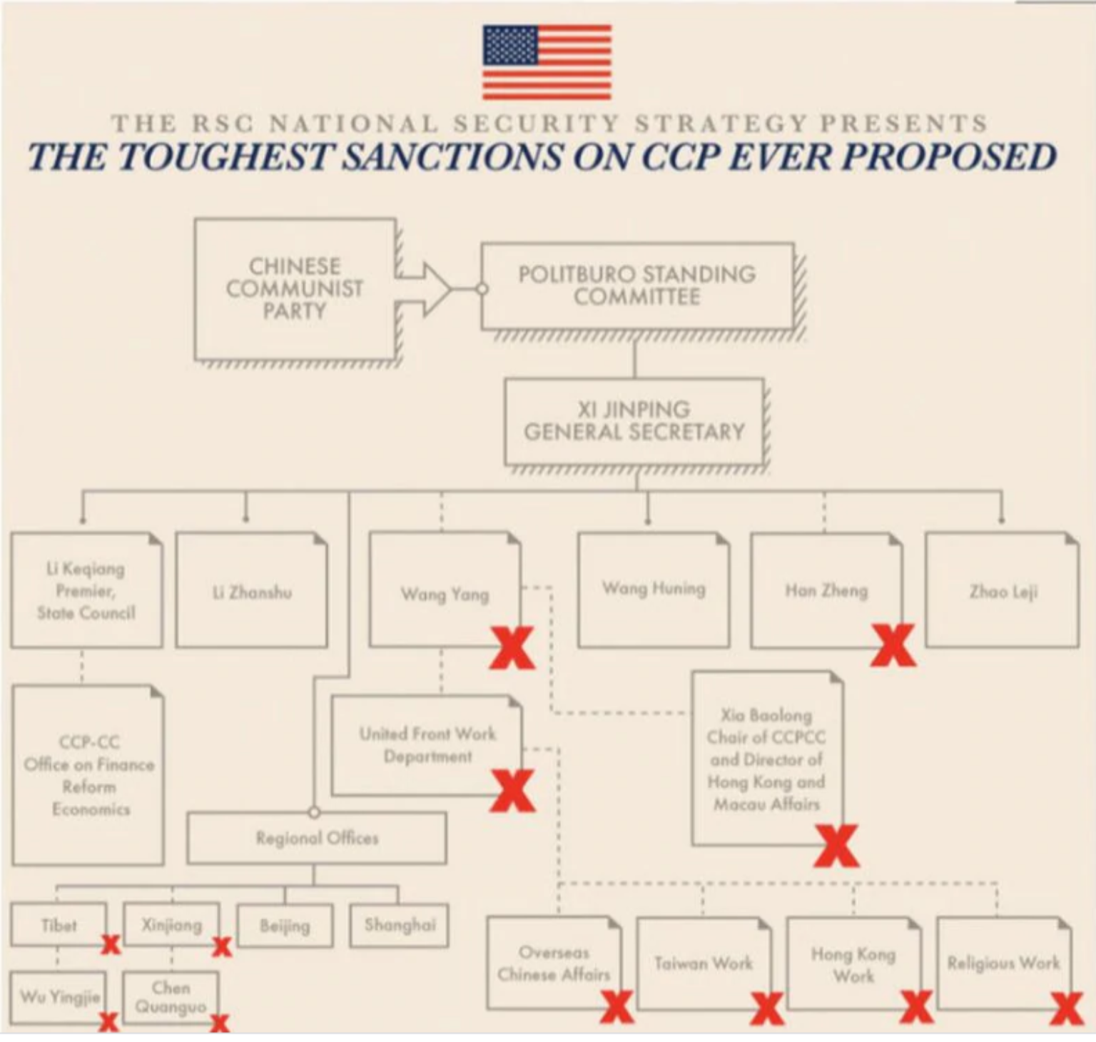 其中,中國被標記為「美國的頭號威脅」,點名制裁踐踏人權的中國共產黨高層官員。該報告附帶一份中共高層權力的結構圖,以紅色的「X」標誌,標記應該制裁的中共官員。