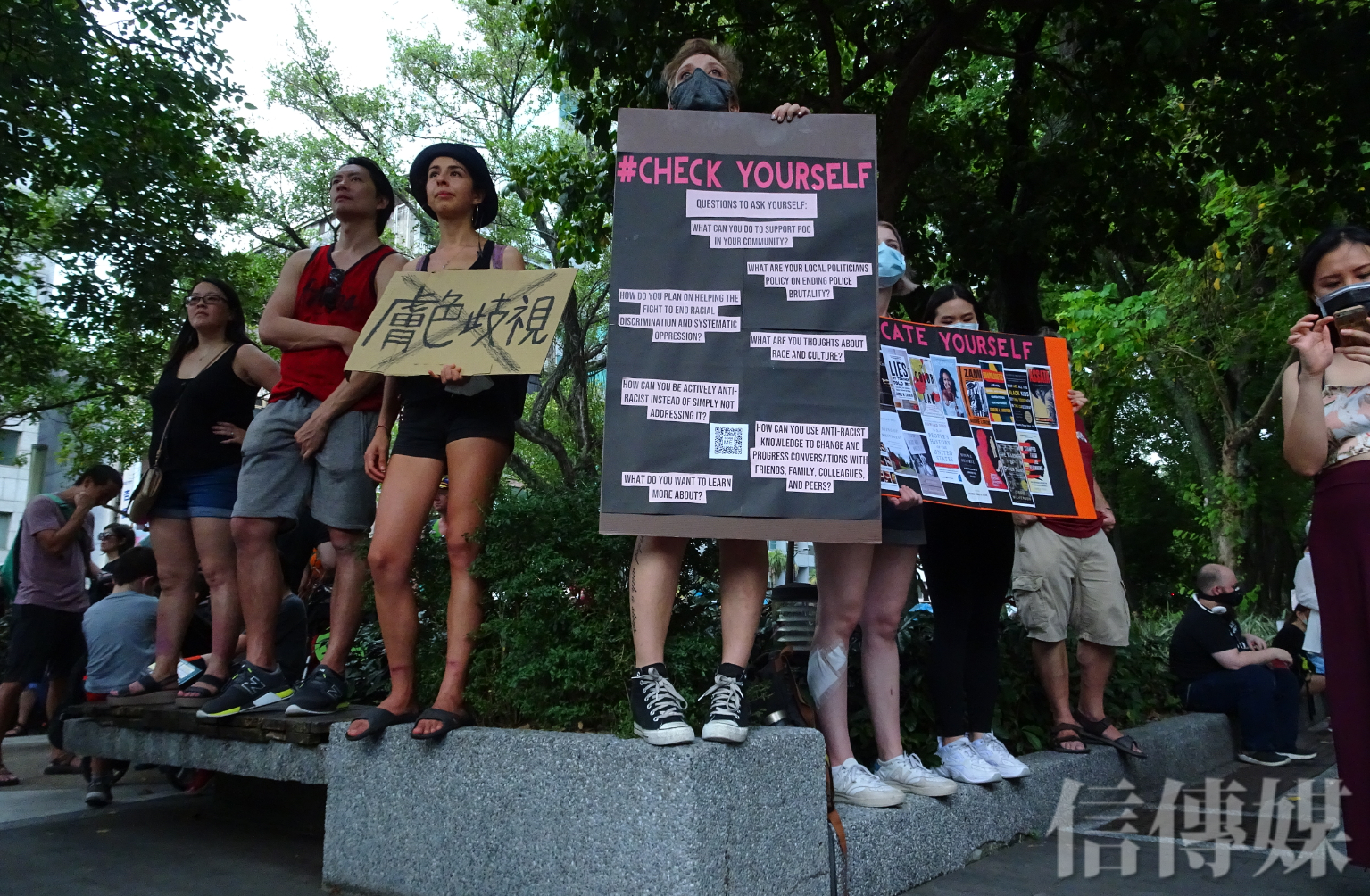今(13)日在台外籍人士更於台北街頭舉辦聲援集會,由團體「全球黑人生命團結倡議組織」(Black Lives Solidarity Global Initiative)舉辦,多人自製標語表達反種族歧視以及追求公義等標語,群眾在活動中進行默哀表達聲援。