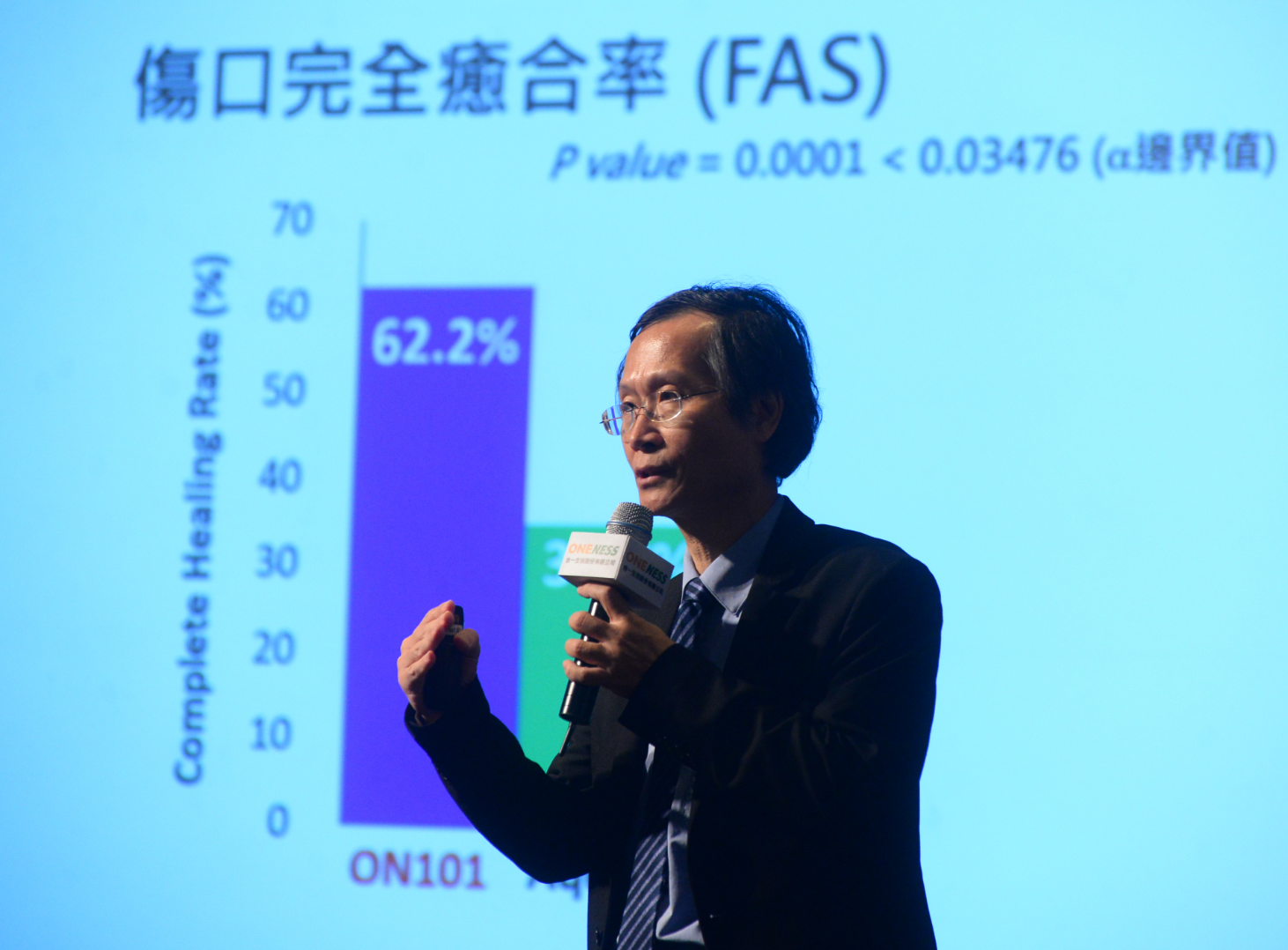 路孔明表示,這個實驗所有使用藥物的病人經過16周後,有多少比率病人傷口癒合,第二個標準通過的標準為,要花多少時間,有一半的受測者達到傷口癒合,ON101整體實驗癒合比例達62.2%,優於AQUACEL的34.7%,並在14周內讓50%病人傷口癒合,AQUACE沒辦法達到50%病人傷口癒合。