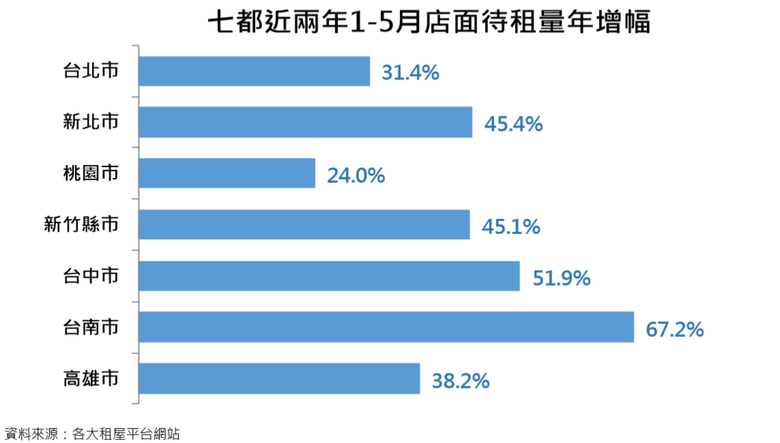 根據永慶房仲網統計,七大都會區今年前5月的店面委售量增加了13.2%,其中以台中年增26.7%最高;另一方面,從網路待租店面的統計也顯示,七大都會區前5月整體店面待租量更是暴增了將近42%,其中,新北、新竹、台中、台南分別同步增加4成以上。