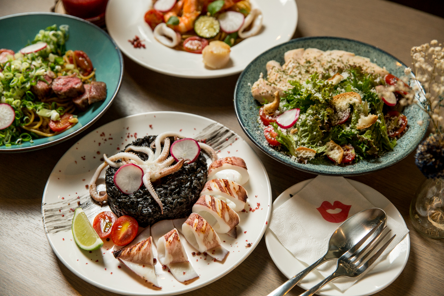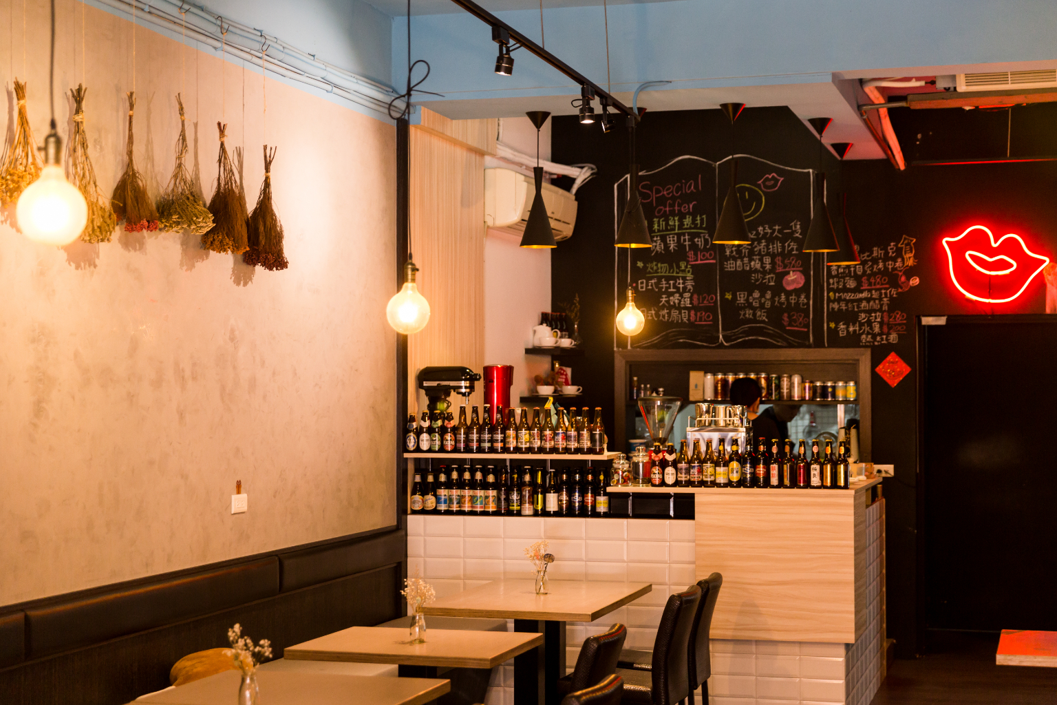 走進「小挑嘴」,工業風的牆面以乾燥花裝飾,映入眼簾的是鮮明的紅唇標誌。愛吃愛煮的情侶檔老闆承諭與妍柔因為都有張挑剔的嘴,決定攜手創業,為大家帶來自己喜歡的好味道。「黑嚕嚕烤中卷燉飯」選用略帶米心口感的義大利米,加入墨魚囊與墨魚醬燉煮,讓每一口都是濃濃海味。「蔓越莓莫西多」以氣泡水為基底,加上自製的蔓越莓果醬、現榨檸檬汁與新鮮薄荷葉,色彩層次分明,還咬得到蔓越莓果粒。