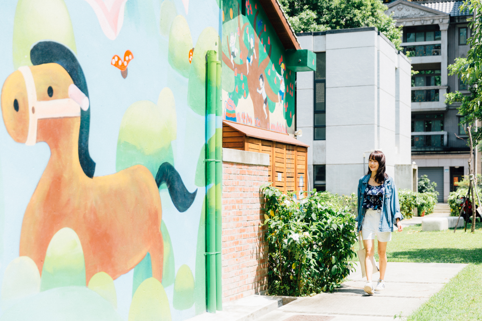 戶外空間有兒童沙坑、翻滾草原與小火車遊樂區,室內空間有院長故事屋、兒童演藝場及共學展示樓,多功能展場空間讓人體驗美學及藝術教育,還有親子藝文街、親子美食坊,進駐美術坊和咖啡館。漫步在園區,建物外牆繪製充滿童趣的大型壁畫,見證歷史的高聳老樹幫忙遮蔭,低頭可見懷舊的跳格子,繽紛的童年氛圍,也讓造訪的人忘卻生活煩悶,回到天真快樂的時光。歲月靜好,看著風吹樹影,回味美好愜意的河畔生活一日遊。