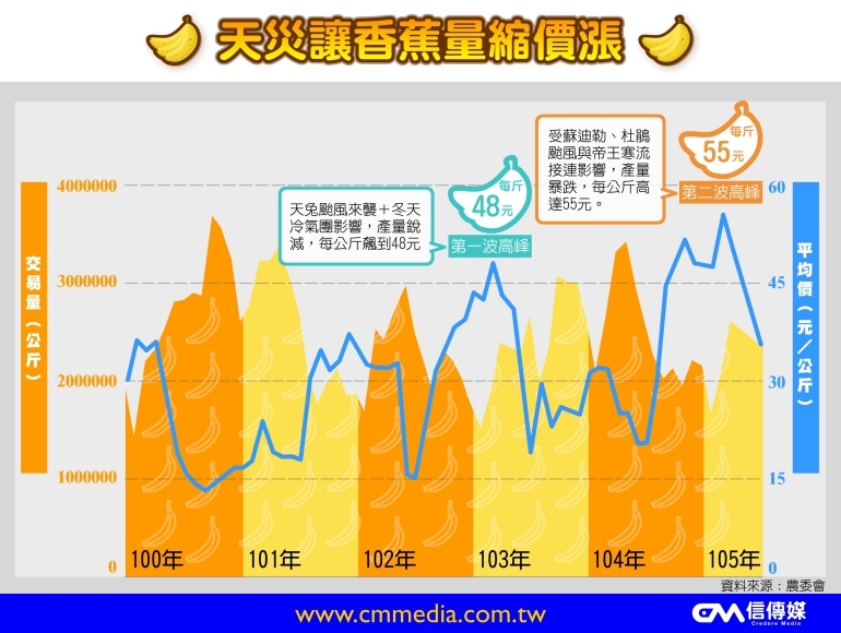 回顧過去三年香蕉零售的平均價,逼近 30元,今年年初寒害後,香蕉的平均價更高達55元,創下有史以來新高價。除了生產成本外,農委會、香蕉研究所和農民都異口同聲指出,去年讓蕉價暴漲的原因以蘇迪勒、杜鵑兩強颱和帝王寒流是三大罪魁禍首。