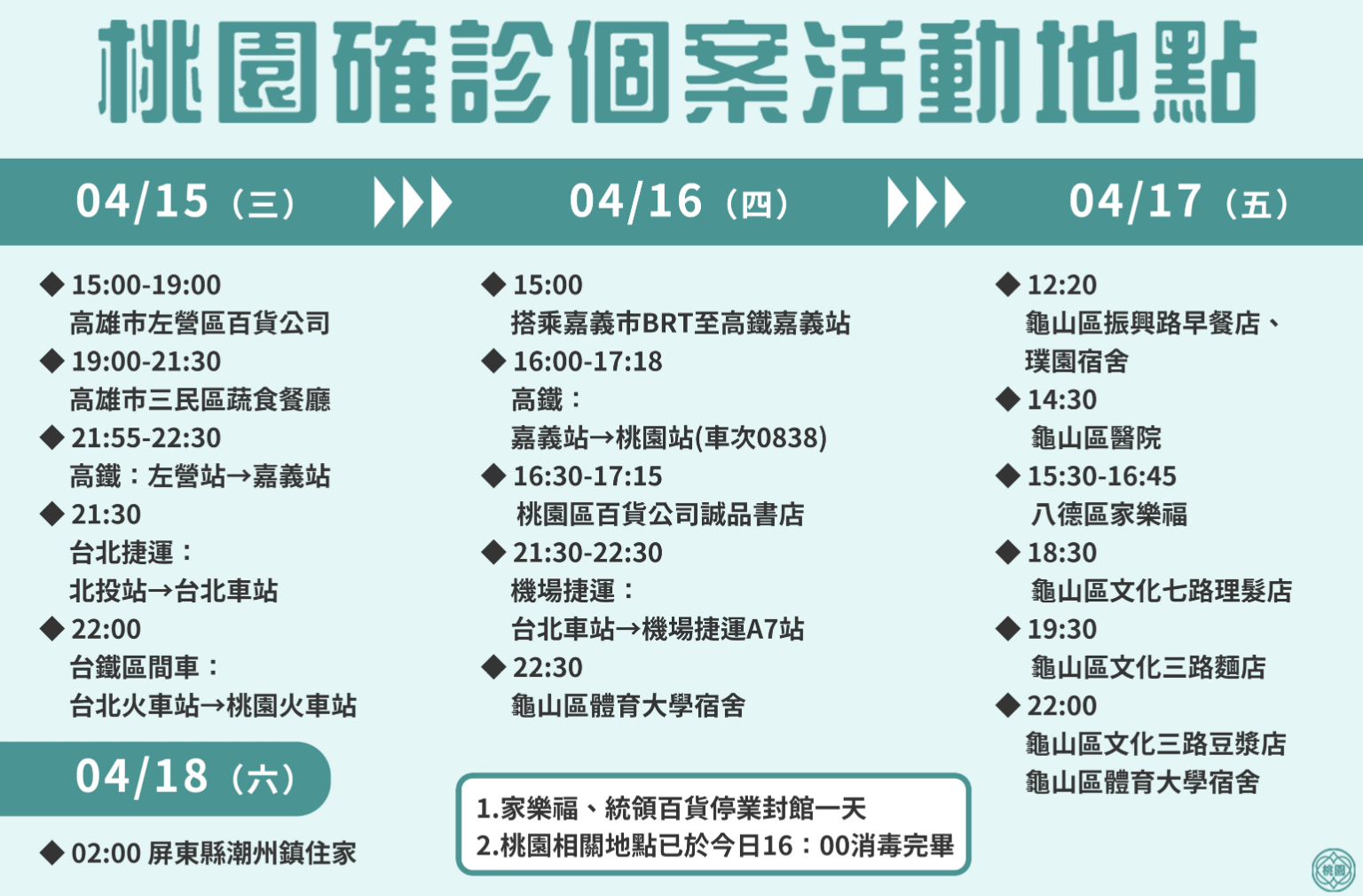 為掌握各類傳染病的流行趨勢,衛生福利部疾病管制署設有法定傳染病監視通報系統,以這次疫情為例,只要有通報採檢個案在桃園,先由各區衛生所進行臨床症狀與TOCC(旅遊史Travel、職業史Occupation、接觸史Contact 及群聚史Cluster)等簡易疫調,確診後,再由桃園市政府衛生局進行二次疫調,從本人自述、親友核對和警察科偵交叉比對,精準回溯並重建生活軌跡。